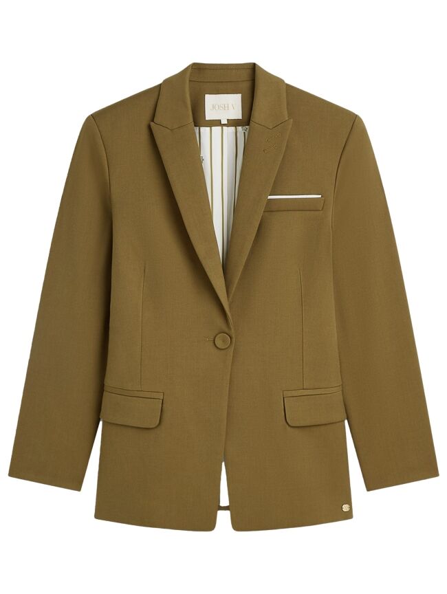 De JOSH V Kanan dames blazer in de kleur Olive Green is een getailleerde blazer met een moderne, vrouwelijke fit. De blazer is uitgevoerd met klassieke flap pockets aan de voorzijde en een knoopsluiting in het midden. Dankzij de blend van gerecycled polyester, viscose, TENCEL™, elastaan en wol voelt de stof soepel en comfortabel aan. Echt een prachtige blazer.