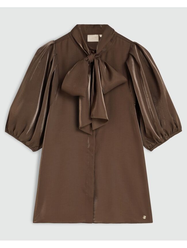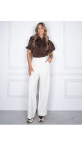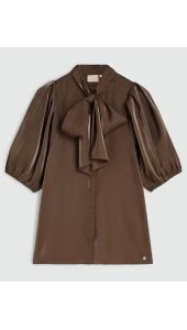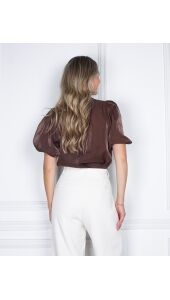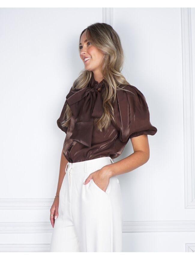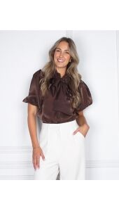 De JOSH V Sylvia damesblouse in de kleur Dark Brown is een absolute musthave die jouw look naar een hoger niveau tilt. De bruine korte mouwen blouse heeft een regular fit en is gemaakt van glanzend organza, een kwaliteit van polyester en gerecycled polyester. De blouse is voorzien van pofmouwen en een strap bij de kraag die je naar wens kunt strikken. Daarnaast kun je de blouse ook zonder strap dragen.