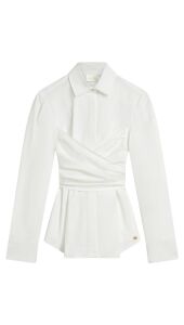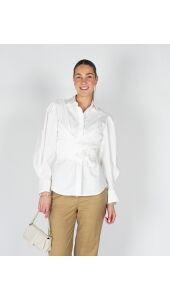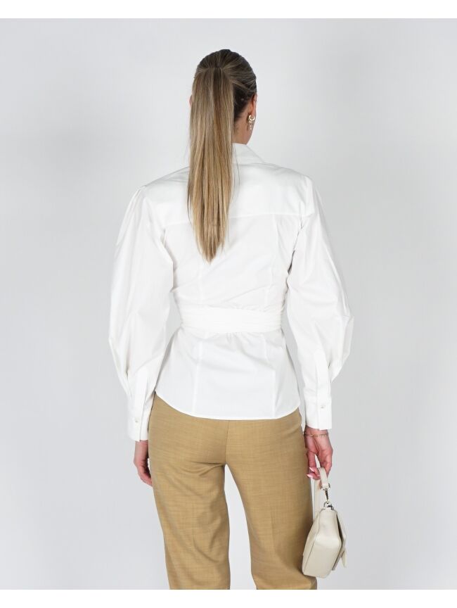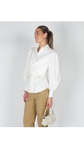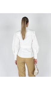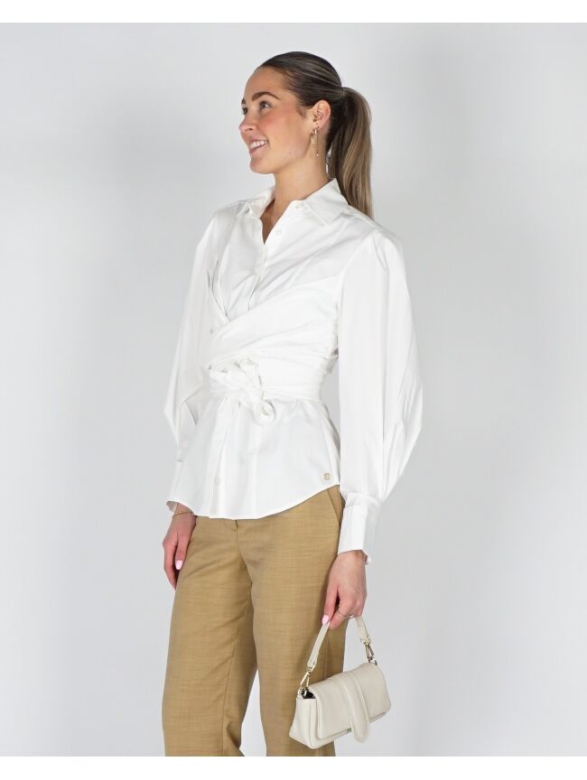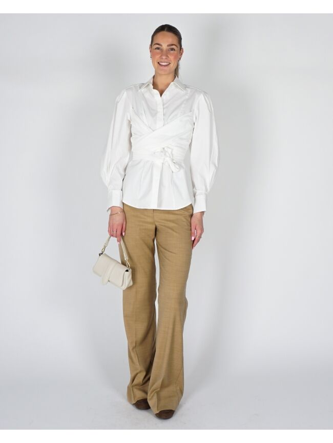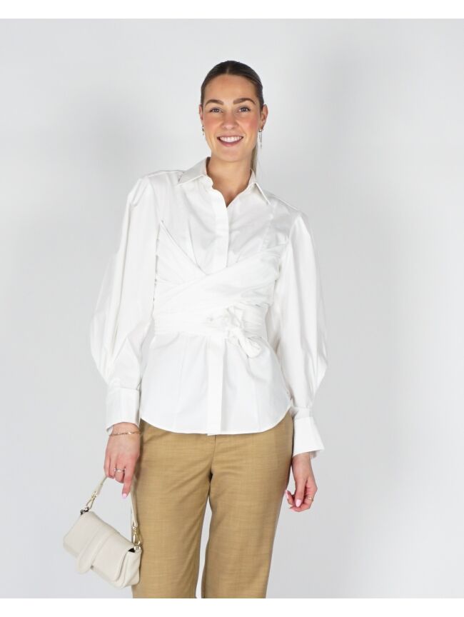 De Luann dames blouse in de kleur Off White is een fitted blouse. Het elegante wrap-detail in de taille en de subtiele pofmouwen zorgen voor een vrouwelijke uitstraling. De blouse is afgewerkt met goudkleurige logoknopen. Stylingtip: draag de witte blouse met een pantalon of high waisted jeans voor een elegante look.