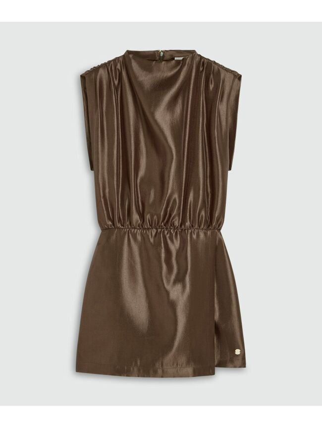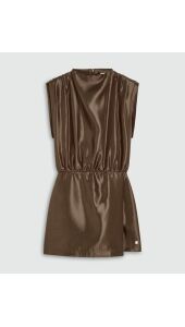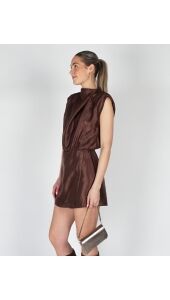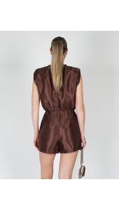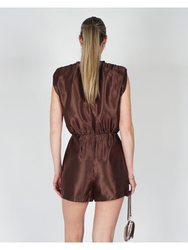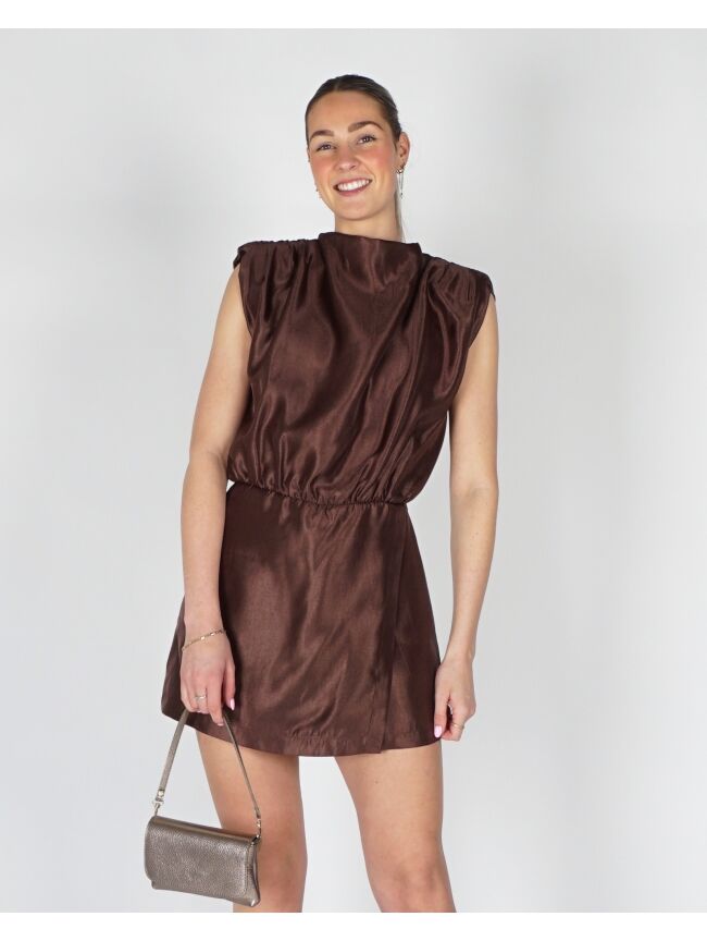 De Lira playsuit in Brown is een regular fit model. De playsuit heeft een hoge watervalhals en sluit door middel van een ritssluiting aan de achterzijde. De schoudervullingen zorgen voor een gestructureerde look, terwijl het overlap-detail in de taille de vrouwelijke vorm accentueert. Stylingtip: Combineer de jumpsuit met sandalen en gouden sieraden voor een elegante avondlook of draag met een oversized blazer en sneakers voor een chique daytime outfit. De donkerbruine playsuit is ook leuk in combinatie met een riem in de taille.