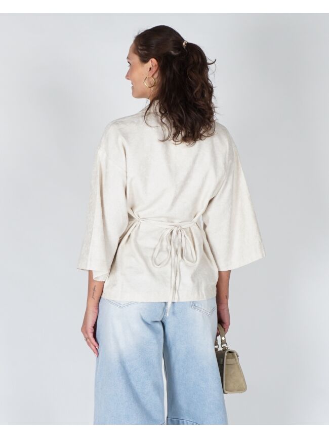 Blouse in een rijke structuurstof met subtiel jacquard patroon. Heeft een klassieke kraag, knoopsluiting en volumineuze 3/4 mouwen. De afneembare strikceintuur laat je spelen met de fit. Valt licht A-lijn voor een effortless, feminine vibe.