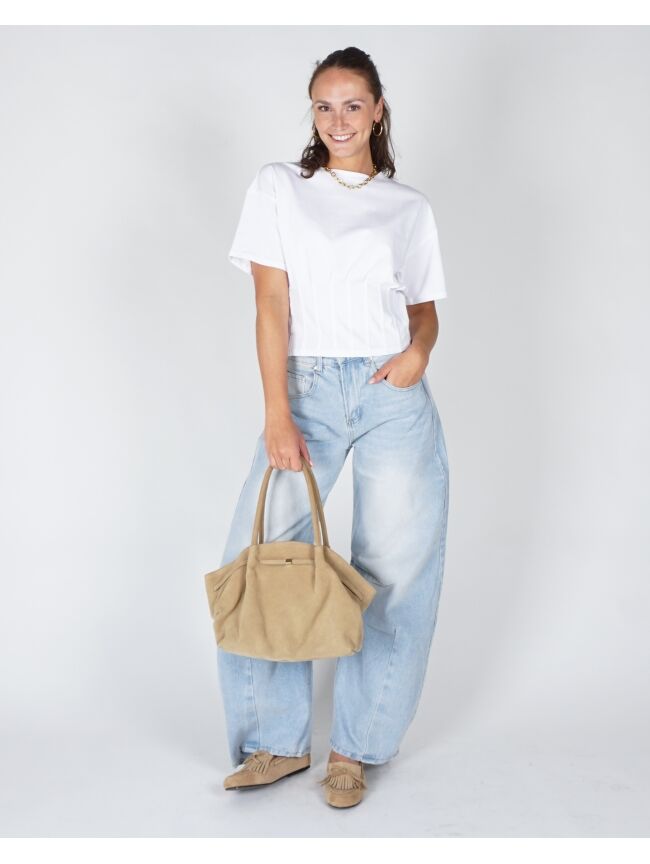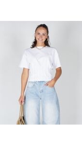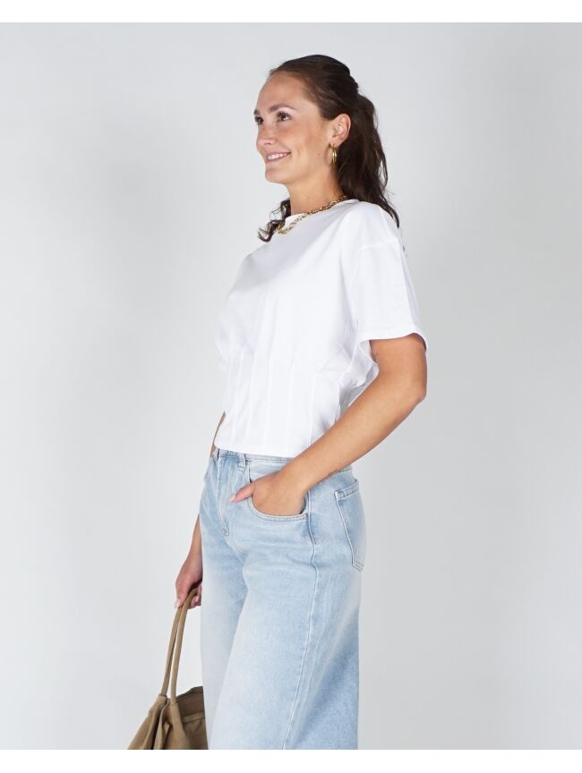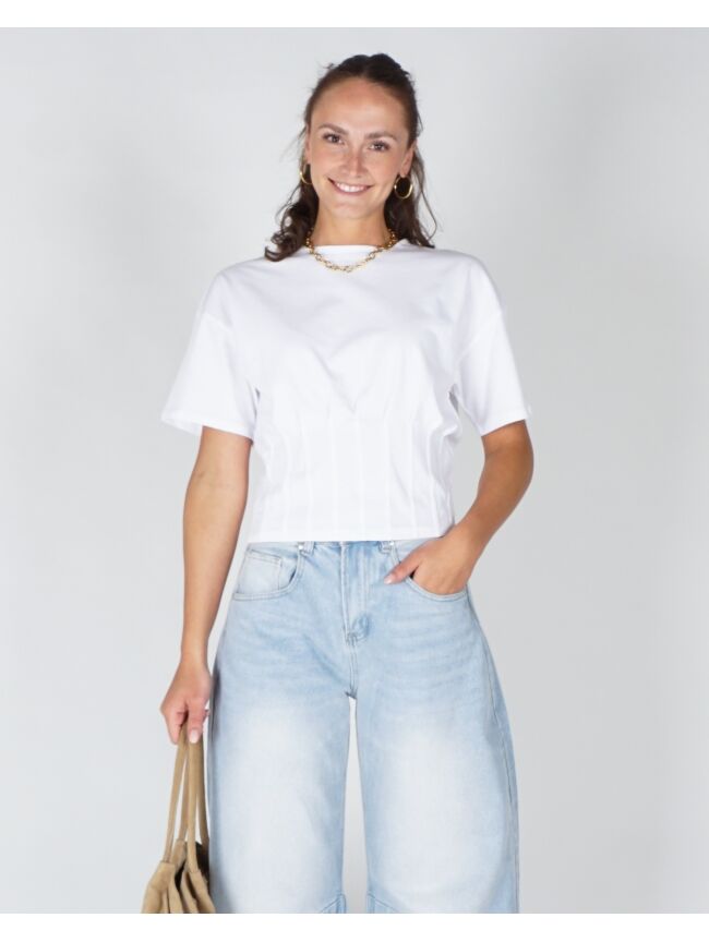 Cropped T-shirt met ronde hals en korte mouwen. De plooitjes aan de voor- en achterkant geven ’m net wat extra flair. Gemaakt van gecertificeerd katoen voor een comfy feel.