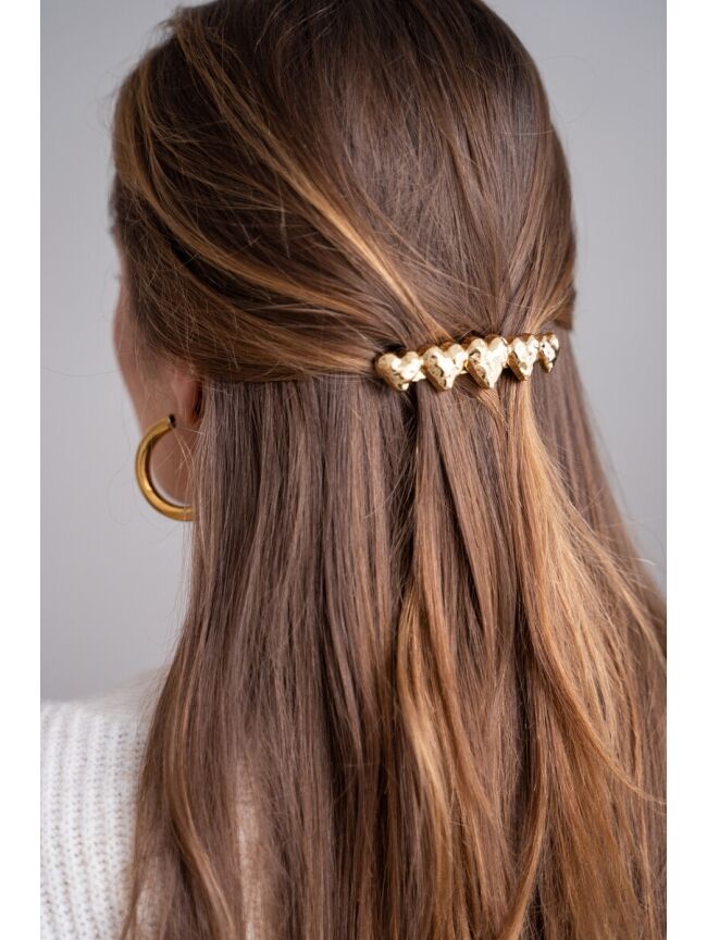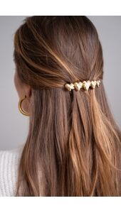 Girl we've got your back! Met deze haarspeld fleur jij jouw look gelijk op. De goudkleurige haarspeld heeft vijf goudkleurige hartjes in verschillende groottes die zorgen voor een vrouwelijke en stijlvolle look. Maak je look af door de mooiste sieraden en accessoires toe te voegen van My Jewellery en voeg dit te leuke haar accessoire snel toe aan je shoppingbag!