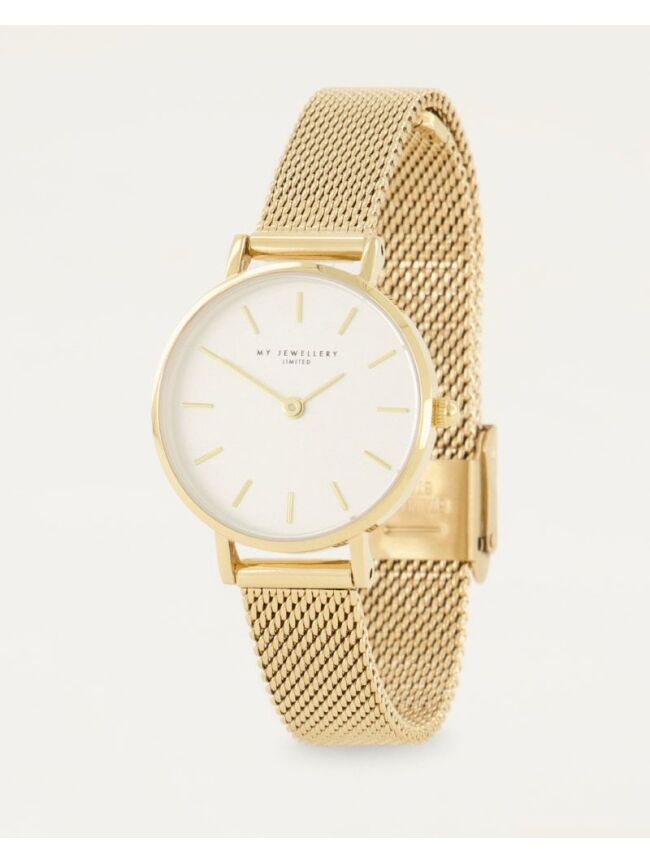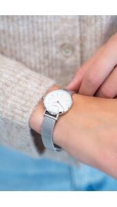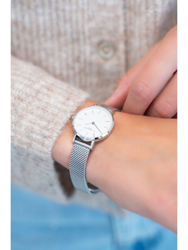 Met dit fashionable horloge met witte wijzer kom je altijd op tijd. Door het mesh bandje & witte achter plaat is dit horloge makkelijk te combineren met je andere sieraden en door het strakke design past het overal bij! We love it.