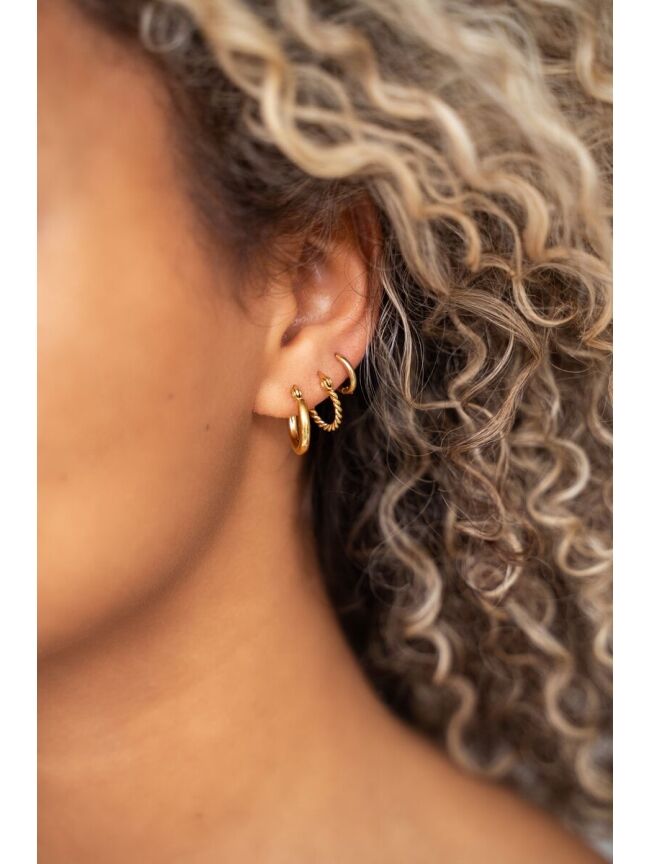 - Afmetingen: de grootste oorring heeft een diameter van 1,8 cm, de middelste oorring heeft een diameter van 1,5 cm en de kleinste oorring heeft een diameter van 1,2 cm