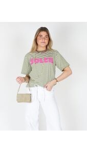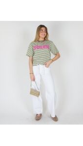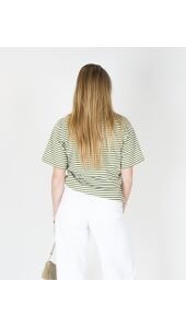 Het groen gestreepte T-shirt “Soleil” geeft je look een frisse en energieke vibe. De groene tinten en subtiele strepen zorgen voor een trendy, effortless uitstraling. Perfect voor elke dag en makkelijk te combineren.