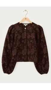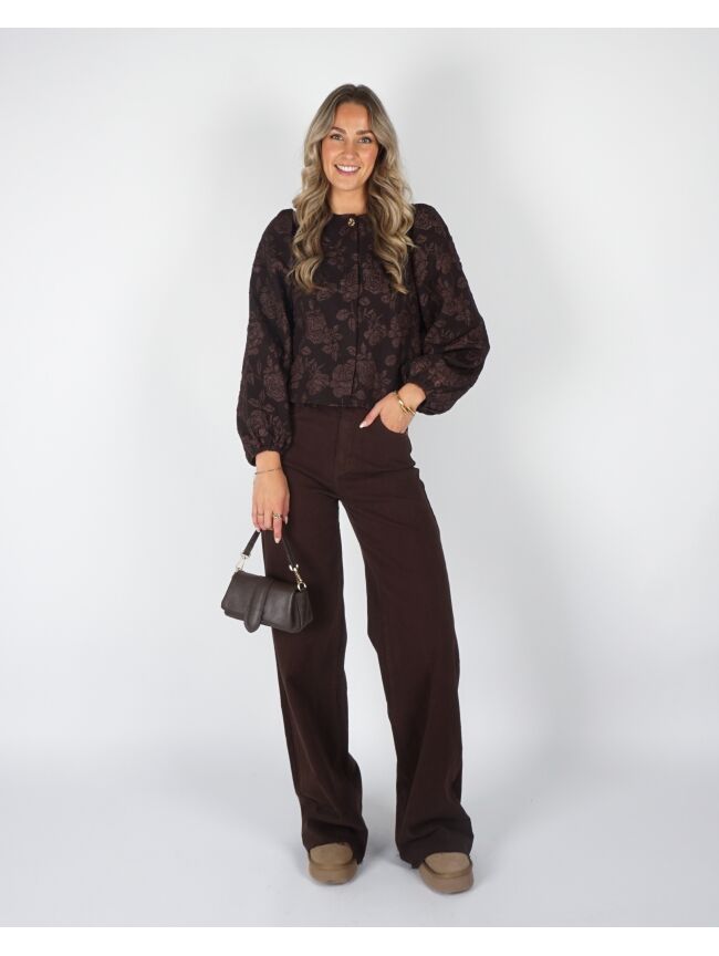 Deze bruine jacquard top met lange pofmouwen is the definition of understated elegance. De rijke jacquard stof geeft een verfijnde structuur en de lange pofmouwen zorgen voor een stijlvolle flair. De diepe bruine tint maakt het kleding item makkelijk te combineren en perfect voor iedere gelegenheid. Van office day tot diner date, this one’s got you covered. Own the moment in style!