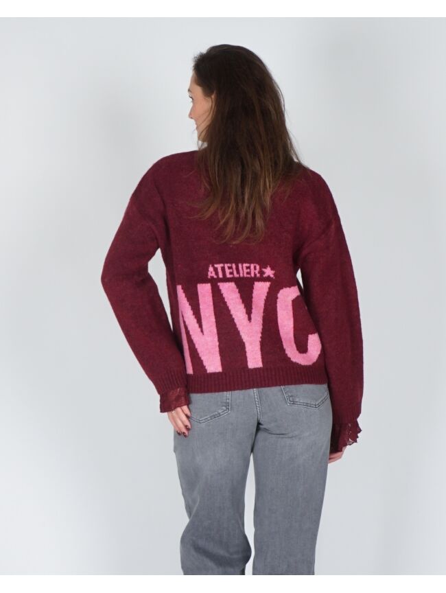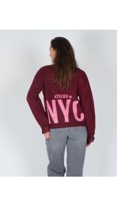 Top? Sweater? Statement. Deze burgundy trui met opvallende backprint “Atelier NYC” is een echte conversation starter. De loose fit zorgt voor een effortless look, terwijl de zachte stof comfort biedt, iedere dag opnieuw. De print aan de achterkant voegt een stoere touch toe aan de trui die perfect past bij de My Jewellery attitude: on-trend, krachtig & confident. Ready to own the room? Let’s make every day a fashion moment!