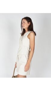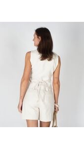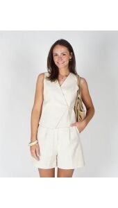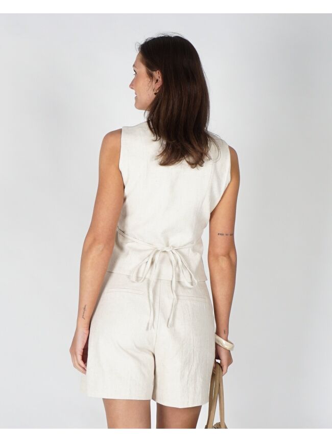 Deze beige gilet is een stijlvolle essential met een moderne en vrouwelijke uitstraling. Het overslagmodel en het strikdetail zorgen voor een elegante en flatterende fit. Perfect te dragen als set met de bijpassende short of los te combineren voor een chic look.