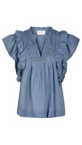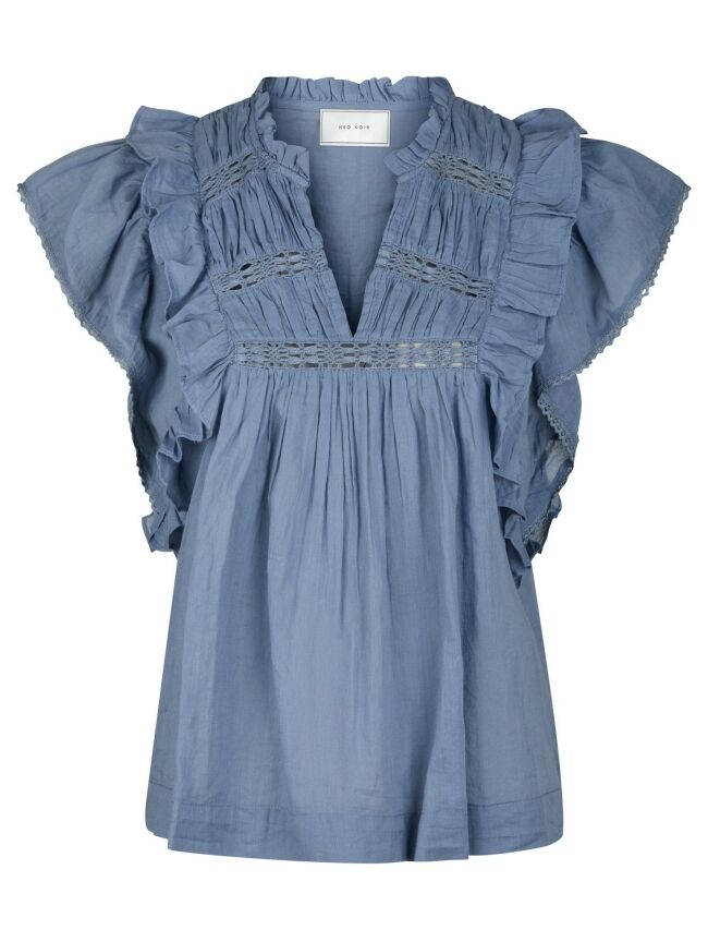 Vrouwelijke mouwloze top met veel details, met tapes en volants. Losse en comfortabele pasvorm, maar toch flatterend.