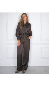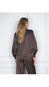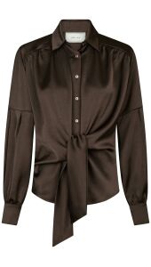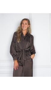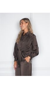 Vrouwelijke blouse met knopen aan de voorkant, plooien op de mouwen en een knoop aan de voorkant waarmee je de blouse losjes of strakker in de taille kunt dragen.