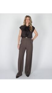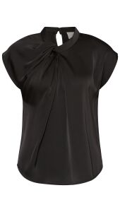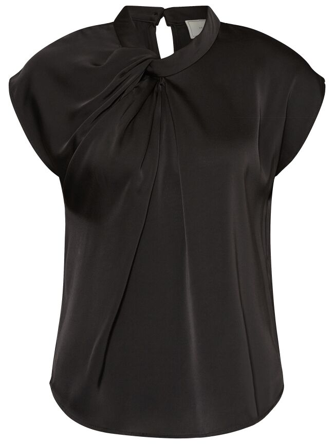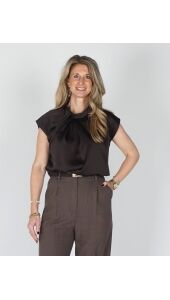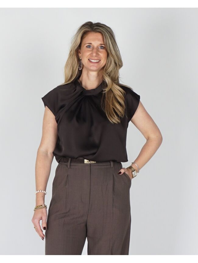 De donkerbruine satijnen blouse van Neo Noir combineert luxe met moeiteloze stijl. Het gedrapeerde design en de fijne plissédetails geven een elegante uitstraling, terwijl de hoge hals en korte mouwen het geheel modern houden. Dankzij de subtiele opening in de nek krijgt de blouse een verfijnde touch. Perfect voor zowel kantoor als feestelijke momenten.