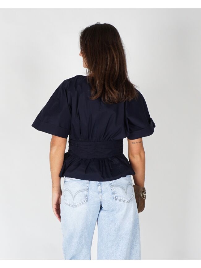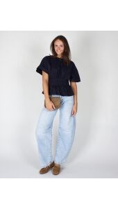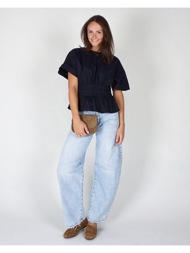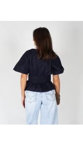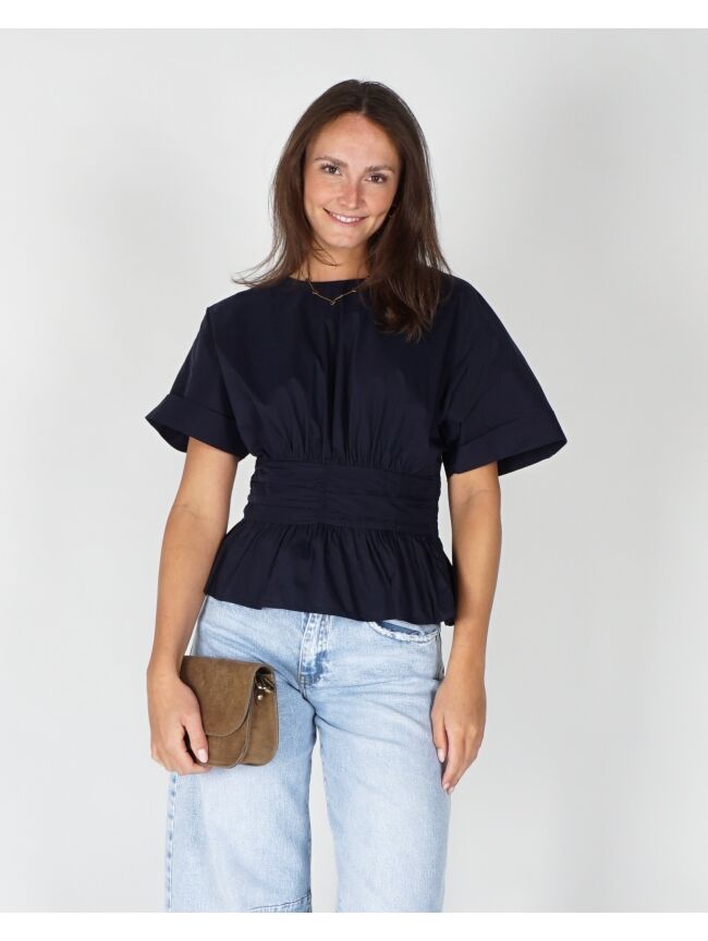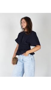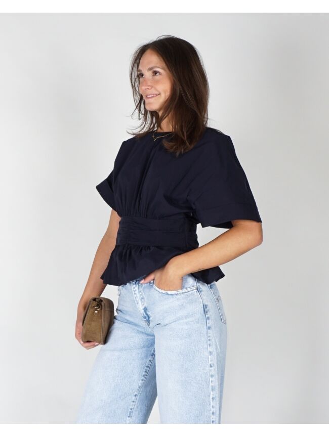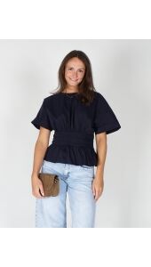Deze donkerblauwe top heeft een elegante en moderne uitstraling. De getailleerde taille en subtiele plooien geven een vrouwelijke en speelse touch. Perfect te combineren met een pantalon voor een stijlvolle look.