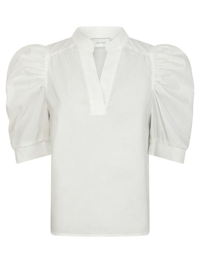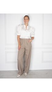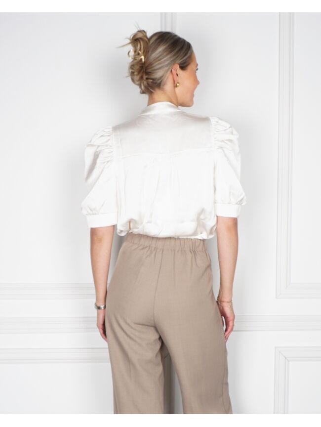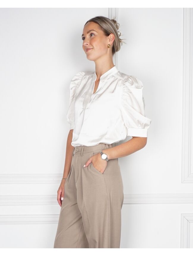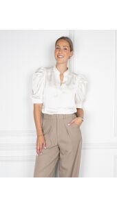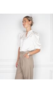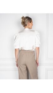 Satijnenlook blouse met leuke pofmouw. De blouse heeft een opening aan de voorkant en een pofdetail aan de mouw en komt in een prachtige off white kleur.