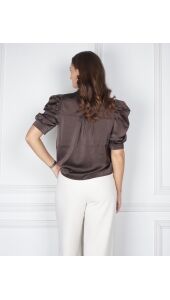 Satijnenlook blouse met leuke pofmouw. De blouse heeft een opening aan de voorkant en een pofdetail aan de mouw en komt in een prachtige bruine kleur.