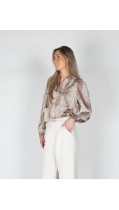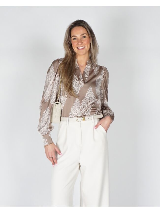 Deze taupe blouse heeft een speels paisleypatroon in een lichte kleur. De satijnen stof geeft een mooie glans en voelt soepel aan. De V-hals met een klein opstaand kraagje zorgt voor een trendy touch. Dankzij het pull-over model trek je de blouse makkelijk aan. Perfect om te combineren met een jeans voor een casual look of met een nette broek voor een chiquere outfit.