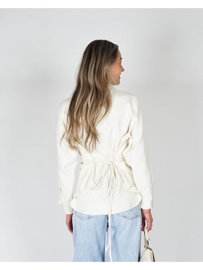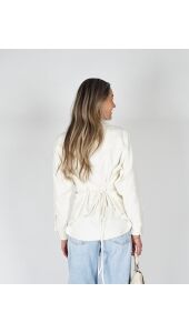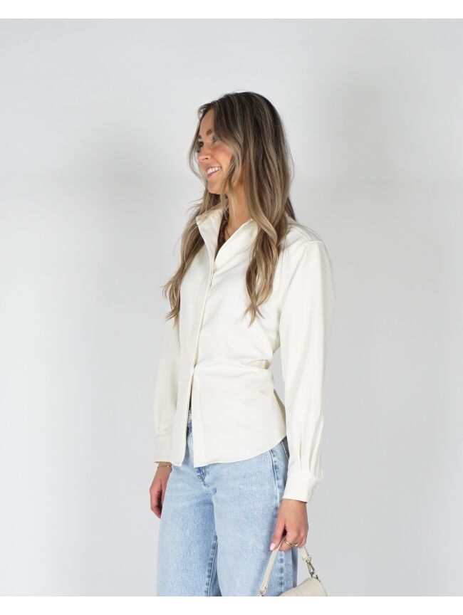 Deze getailleerde ecru blouse heeft een clean, moderne look met een subtiel detail. Aan de achterkant zitten touwtjes waarmee je zelf de strakheid bepaalt, wat zorgt voor een mooie, vrouwelijke pasvorm. De ecru kleur houdt het geheel rustig en tijdloos, terwijl het silhouet net wat spannender wordt. Makkelijk te stylen en perfect voor een look die er moeiteloos goed uitziet.