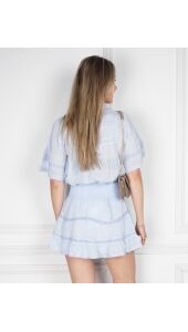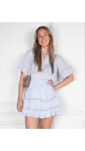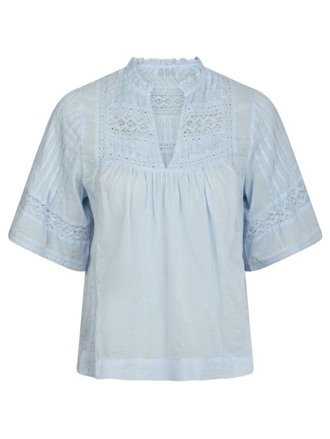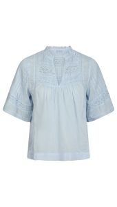 Mooi blouse met mouwen die net boven de elleboog stoppen, en een pasvorm die zowel vrouwelijk als tegelijkertijd licht en los is. De blouse heeft veel mooie details in de vorm van bandapplicaties en kleine plooien.