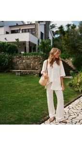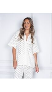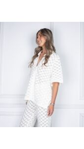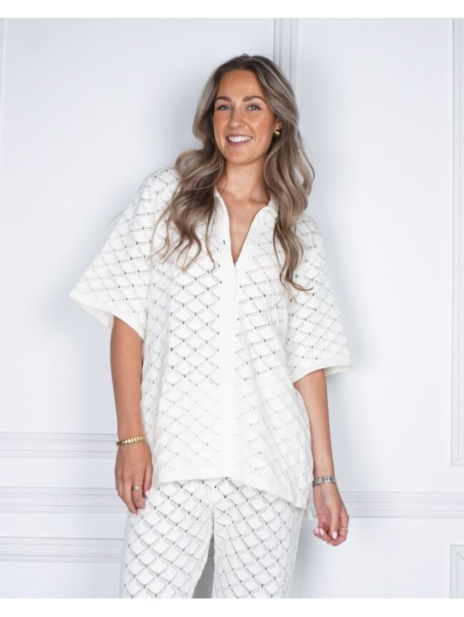 Gehaakte blouse van Neo Noir in gebroken wit. De blouse heeft een ruitpatroon in een haakpatroon met een overhemdkraag en knoopjes aan de voorkant. De losse pasvorm zorgt voor veel bewegingsvrijheid. Wij zijn helemaal fan van deze set. Combineer de blouse met de bijpassende broek of los op je favoriete jeans.