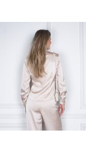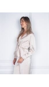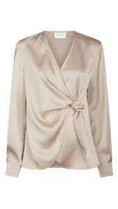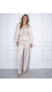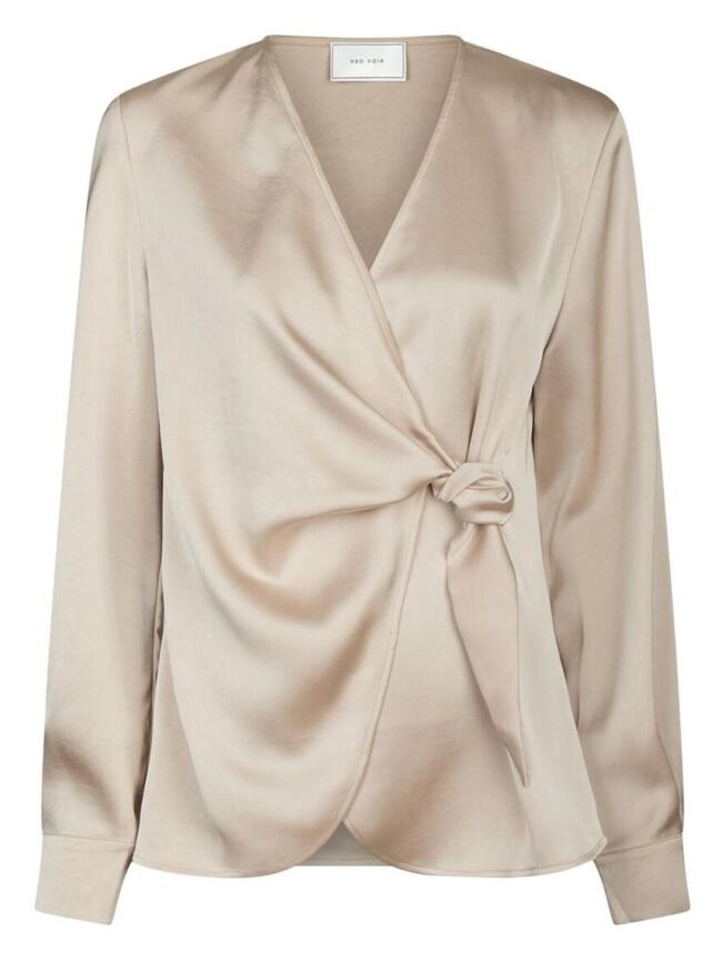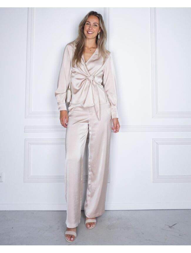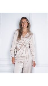 Met zijn elegante drapering en verfijnde strikdetail aan de zijkant, biedt deze blouse een subtiele luxe. De glanzende stof en perfecte pasvorm maken het een must-have voor iedere gelegenheid.