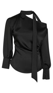 Hoe chic is deze zwarte satijnen blouse van Neo Noir met een asymmetrisch schouderontwerp. De blouse heeft lange mouwen met licht gepofte schouders en een strikdetail bij de hals. Echt een favoriet!
