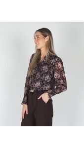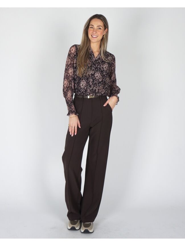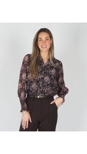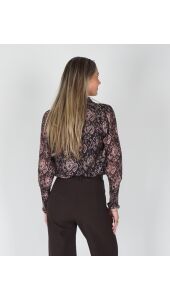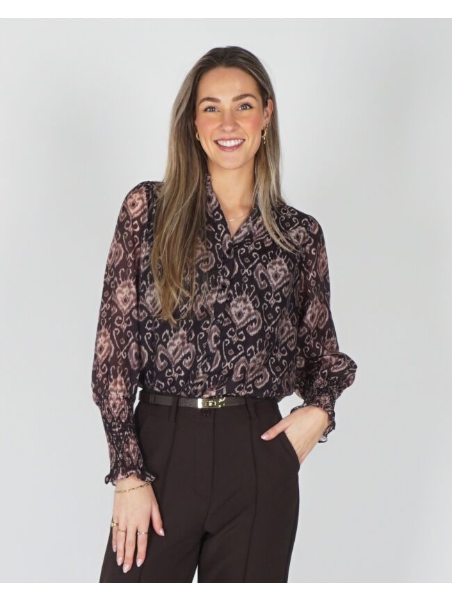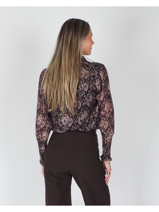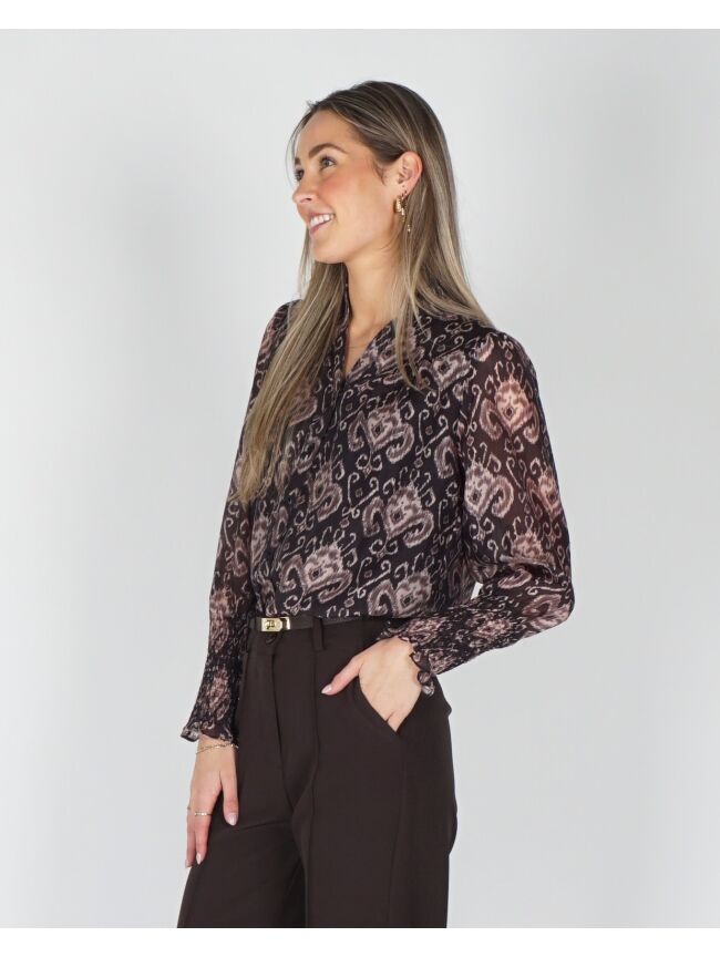 Deze zwarte blouse van Neo Noir springt eruit door het stijlvolle bruin-crèmekleurige patroon. De blouse heeft een klassieke overhemdkraag en een nette knoopsluiting aan de voorkant, waardoor hij zowel casual als chic te dragen is. De lange mouwen zijn afgewerkt met smockdetails bij de manchetten, wat zorgt voor een vrouwelijk en elegant effect. Een tijdloze blouse die moeiteloos met elke outfit combineert.