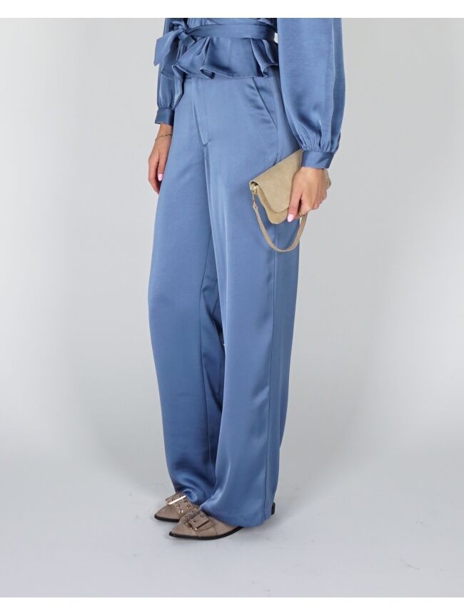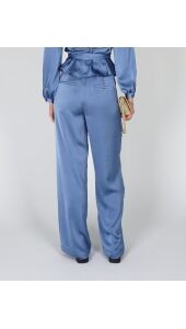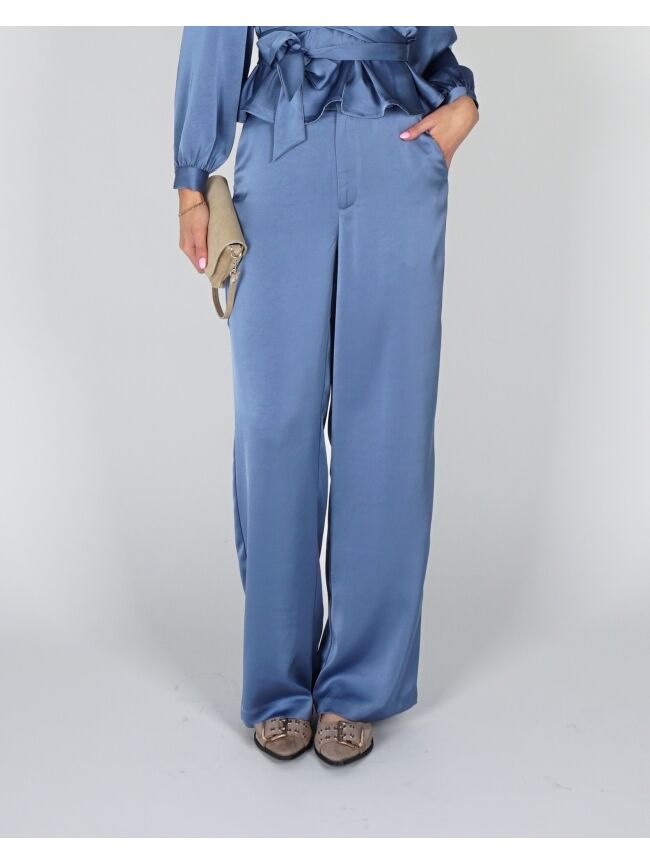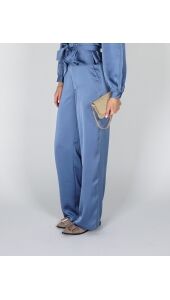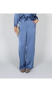 Deze blauwe satijnen pantalon heeft een rustige, stijlvolle uitstraling. De satijnen stof valt soepel en geeft de broek een nette look zonder overdreven glans. Door de tijdloze blauwe kleur is hij makkelijk te combineren met verschillende tops en geschikt voor zowel casual als iets nettere outfits. Een fijne broek die er altijd verzorgd uitziet.