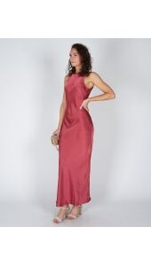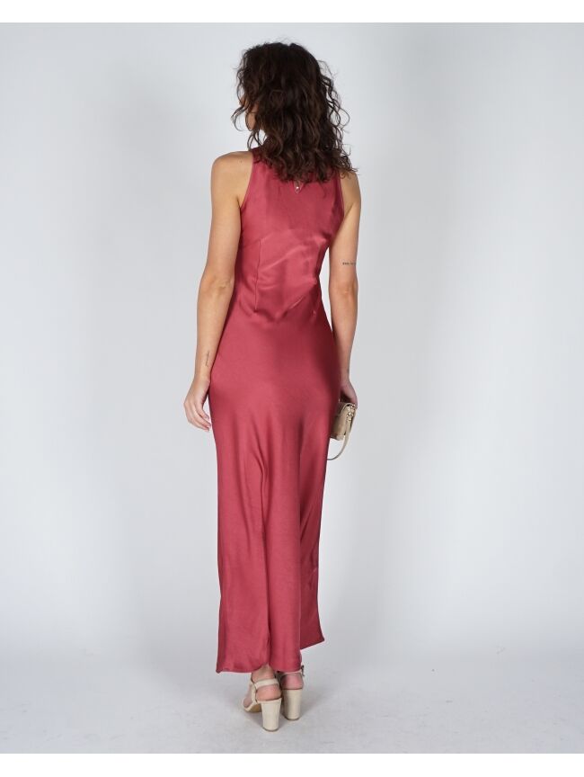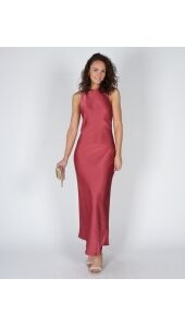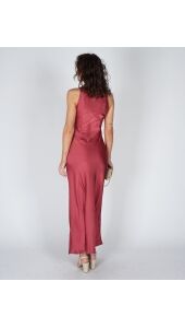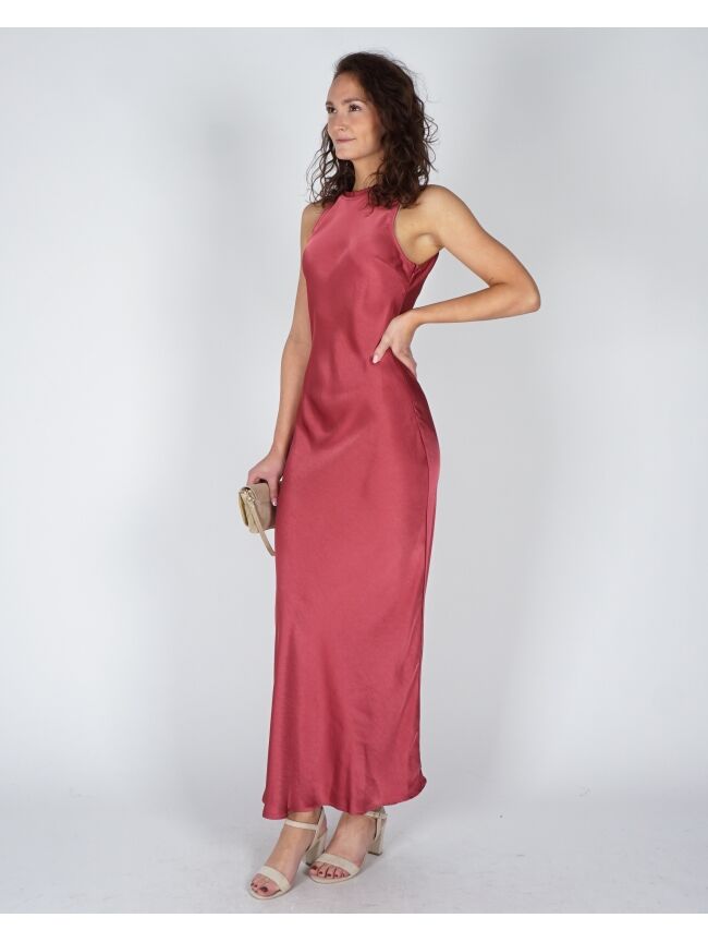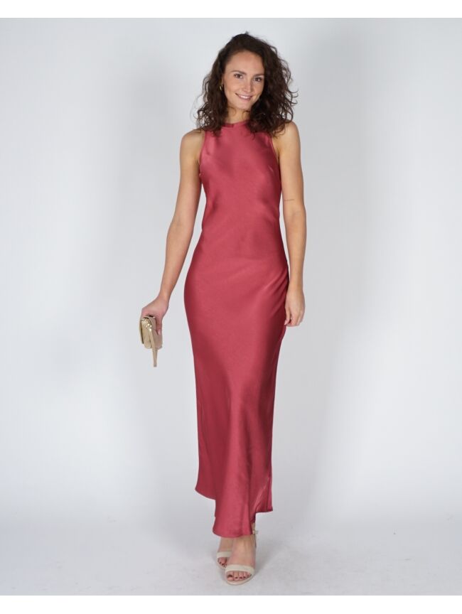 Deze lange, mouwloze roze jurk is gemaakt van zware satijn en valt mooi om het lichaam. De aangesloten pasvorm en ronde hals zorgen voor een strakke, rustige look. Makkelijk te stylen en extra mooi in combinatie met de Lara tas in suède zandkleur voor een zachte look. Een jurk die weinig nodig heeft om er goed uit te zien.