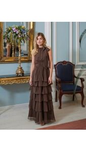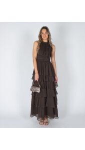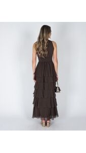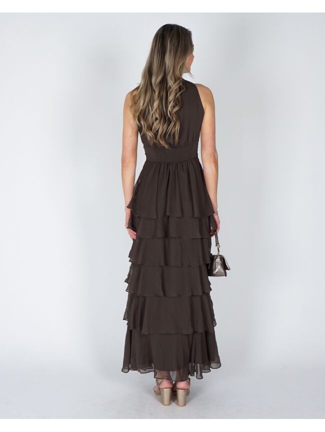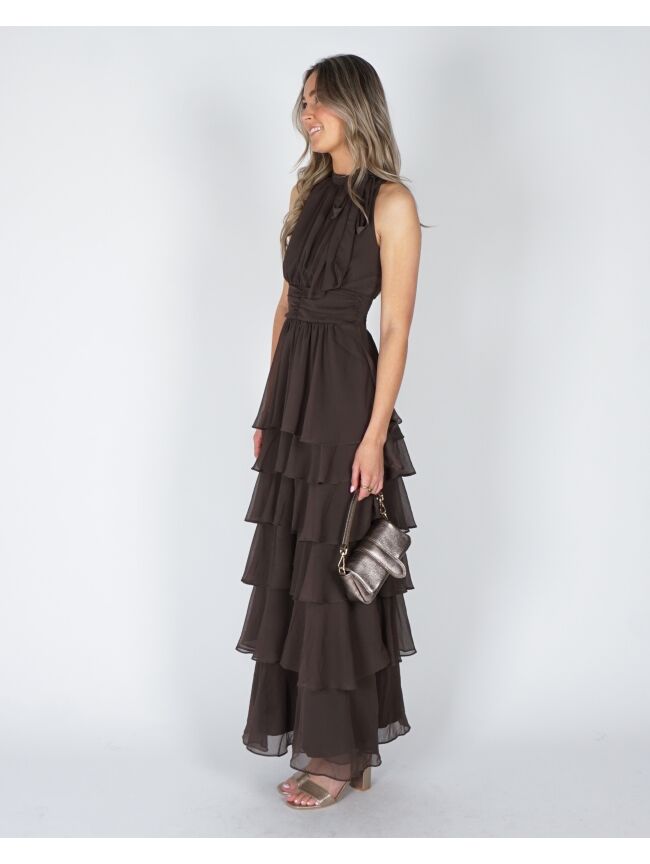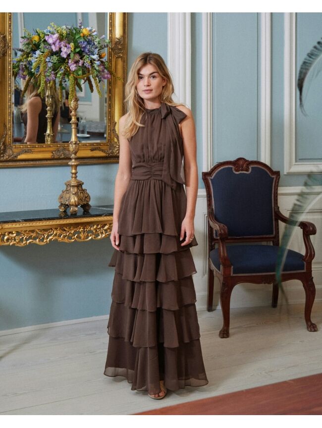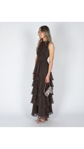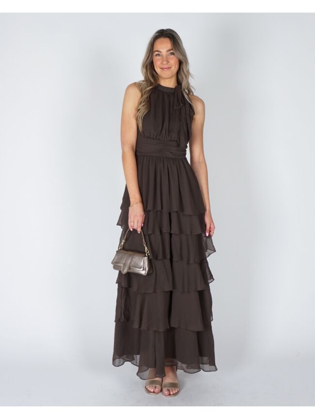 De lange May jurk in bruin heeft een warme, rustige uitstraling. De ruffels geven de jurk een speels en vrolijk detail. Makkelijk te stylen met zowel hakken als boots