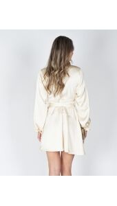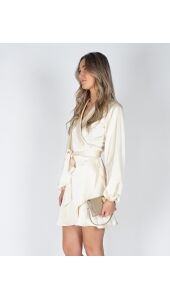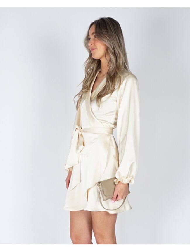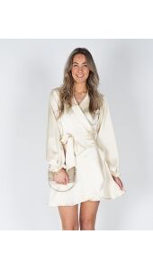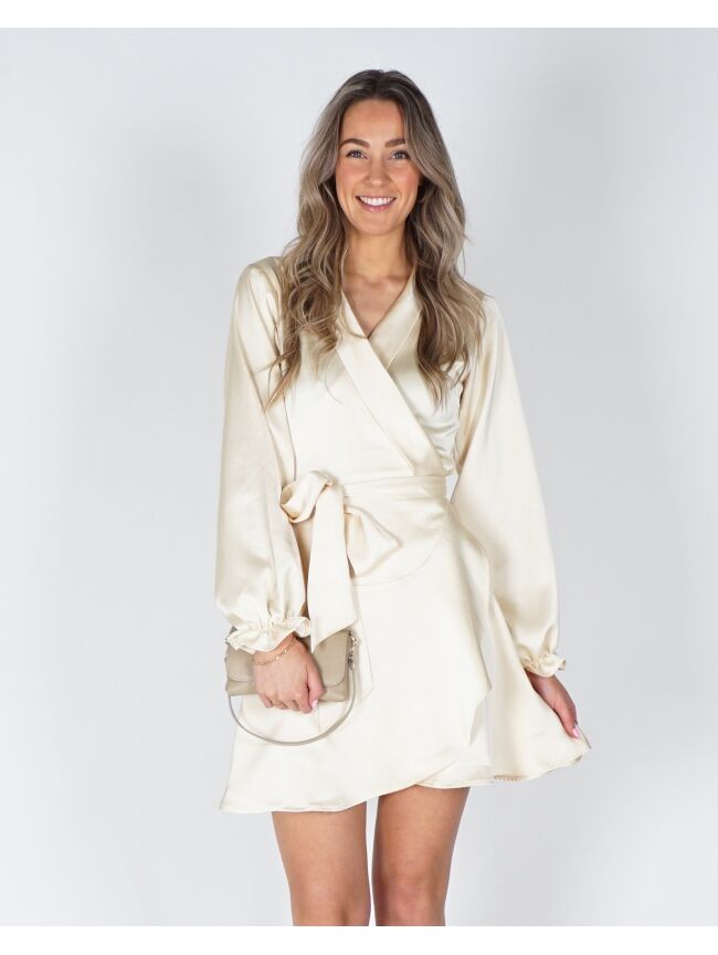 Deze lichtgele jurk van zware satijn voelt luxe aan en valt mooi. De V-hals en het overslagmodel zorgen voor een fijne pasvorm, terwijl je met de strikceintuur de taille zelf kunt accentueren. De lange mouwen maken ’m geschikt voor verschillende momenten.