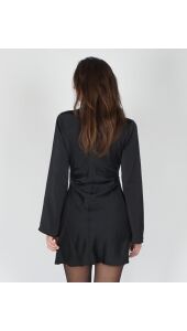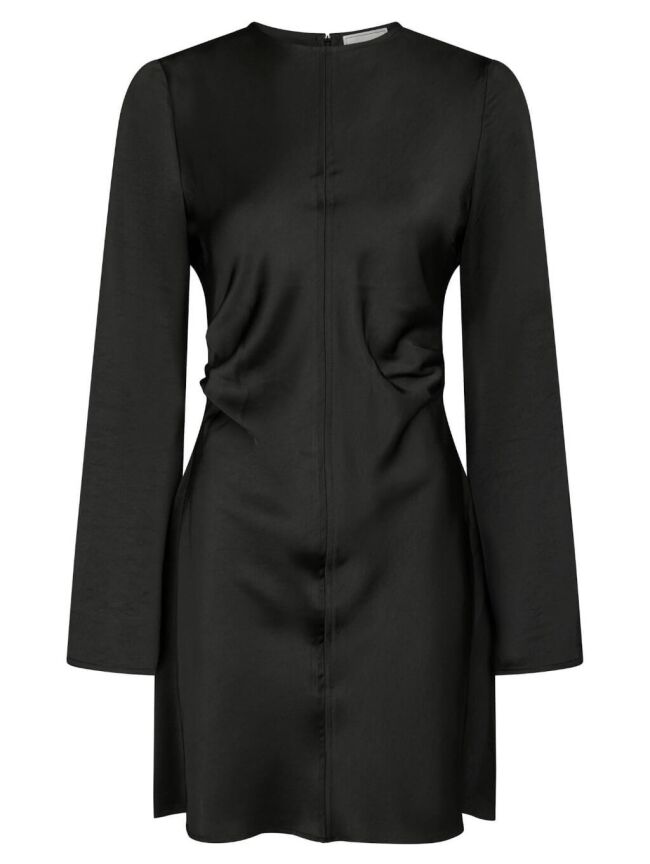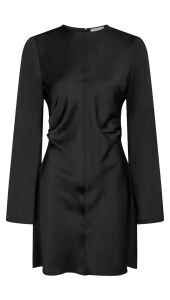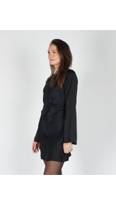 Deze zwarte satijnen jurk heeft een elegante aansluitende pasvorm die je silhouet mooi benadrukt. De lange, wijde mouwen en subtiele ruches geven de jurk een chique, vrouwelijke uitstraling. Dankzij de verborgen rits aan de achterkant trek je de jurk gemakkelijk aan en uit. Perfect voor feestelijke gelegenheden, avondjes uit of elke moment waarop je wilt stralen in een stijlvolle satijnen look.