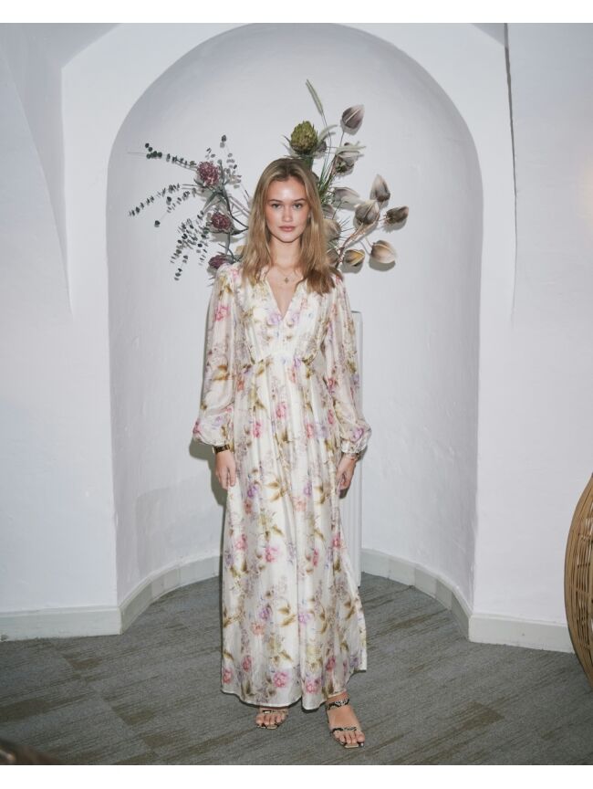 Deze offwhite jurk met bloemenprint in zachte pasteltinten heeft een lichte, frisse uitstraling. De V-hals en lange mouwen geven ’m een mooie, rustige look en door de losse pasvorm draagt de jurk comfortabel. Makkelijk te stylen en extra mooi in combinatie met de Lara Classic tas in brons.