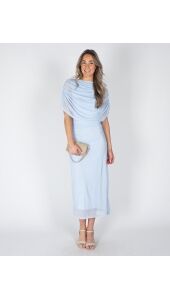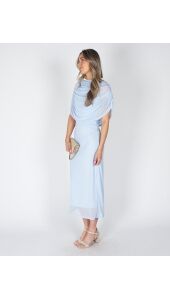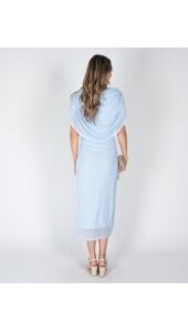 Deze lichtblauwe jurk met gedrapeerd design heeft een verfijnde, moderne uitstraling. De doorschijnende stof en subtiele plooidetails geven de jurk een speelse maar rustige look. Het draperende model valt mooi om het lichaam en zorgt voor een elegant silhouet. Een jurk die je makkelijk draagt en er toch verzorgd uitziet, perfect voor zowel overdag als ’s avonds. Leuk afgestyled met een klein beige tasje.
