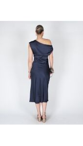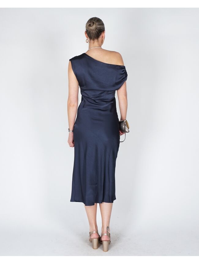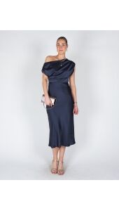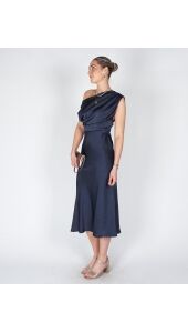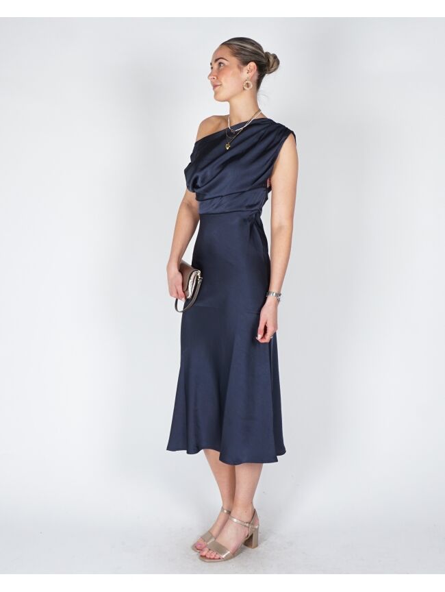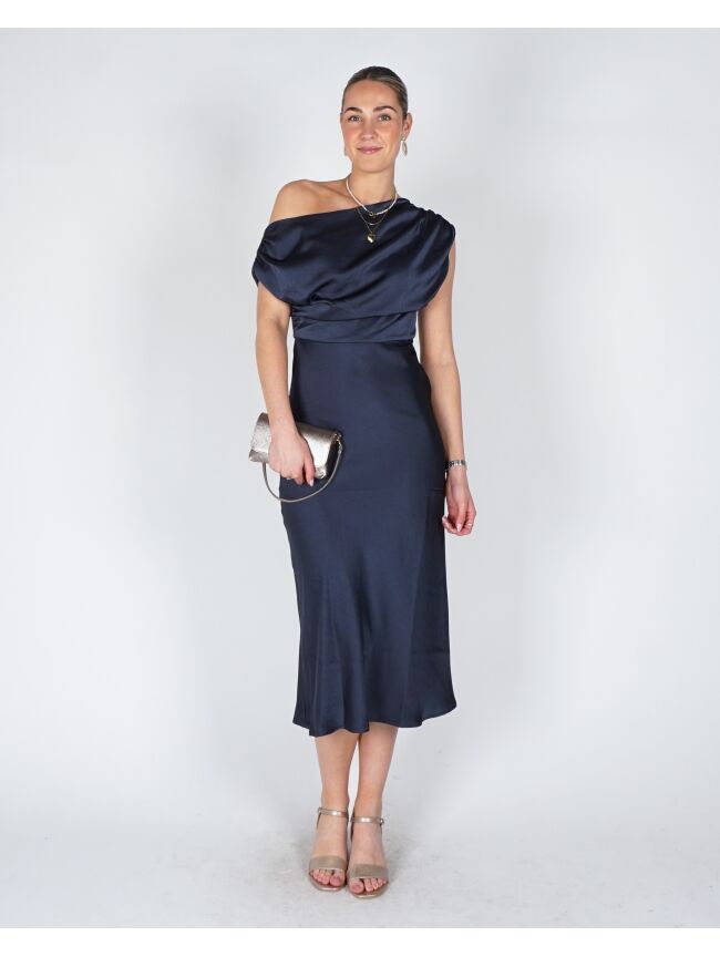 Straal pure klasse uit met deze verfijnde one-shoulder jurk in een luxe satijnen afwerking. De elegante asymmetrische halslijn geeft de jurk een moderne en vrouwelijke uitstraling, terwijl de soepelvallende stof prachtig langs het lichaam glijdt en een flatterend silhouet creëert.