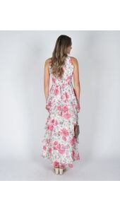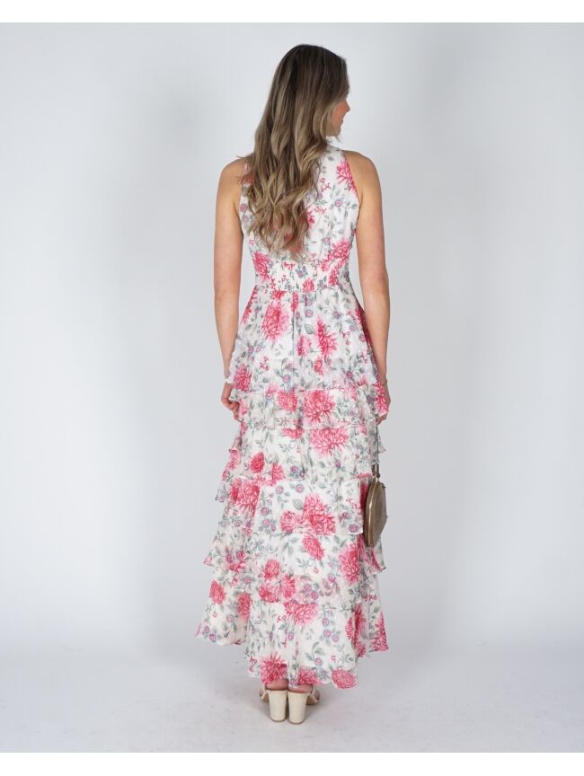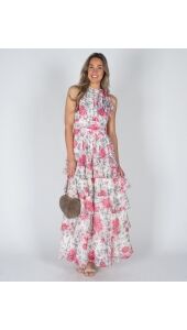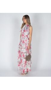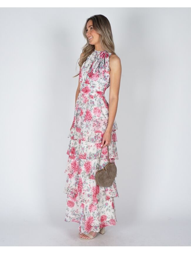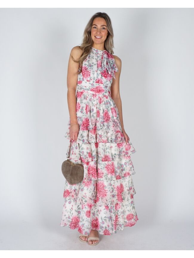 Deze lange bloemenjurk zonder mouwen heeft een frisse, zomerse look. De lagen in de rok geven de jurk extra flow en maken ’m luchtig en speels. Makkelijk om casual te dragen, maar ook leuk door te stylen. Combineer de jurk met de Tas Lamour suède taupe voor een stijlvolle look.