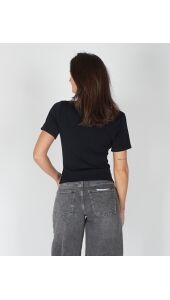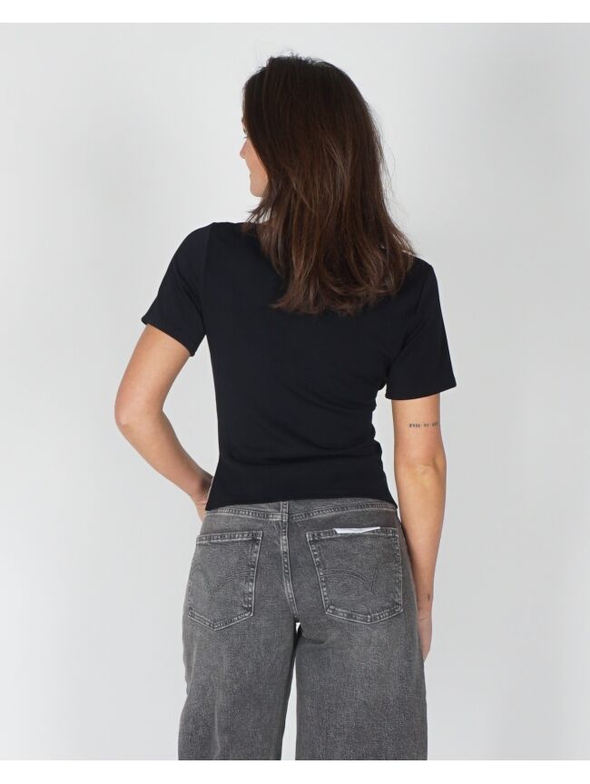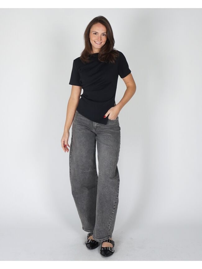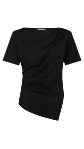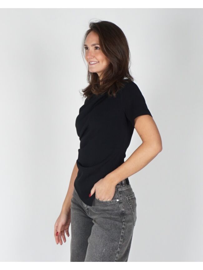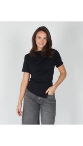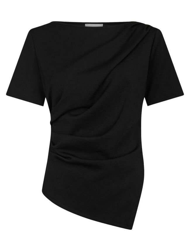 Deze zwarte top van Neo Noir is gemaakt van een zachte en soepele mix van polyester, modal en elastaan, waardoor hij comfortabel draagt en mooi meebeweegt. De plooien aan de voorkant geven een elegante uitstraling, terwijl de asymmetrische zoom zorgt voor een moderne en vrouwelijke touch. Een veelzijdige top die zowel chic als casual gestyled kan worden.