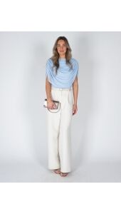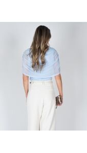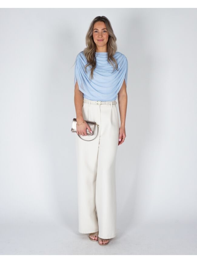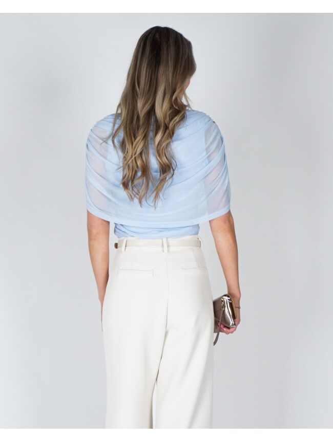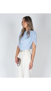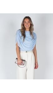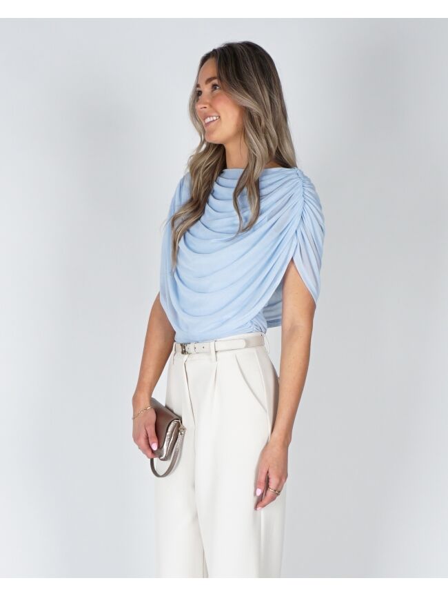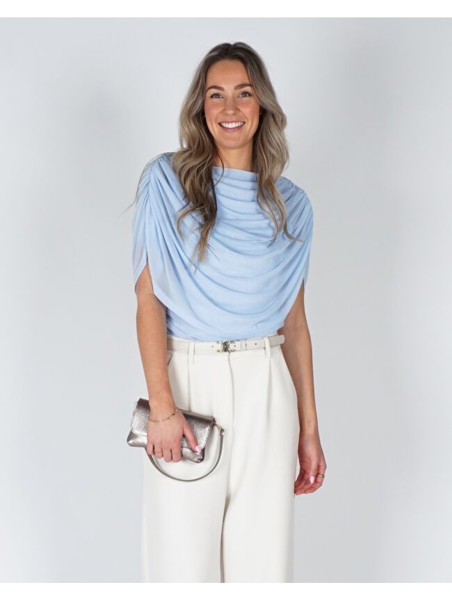 Deze lichtblauwe top met gedrapeerd design heeft een verfijnde, moderne uitstraling. De doorschijnende stof en subtiele plooidetails geven de top een speelse maar rustige look. Het draperende model valt mooi om het lichaam en zorgt voor een elegant silhouet. Perfect te combineren met een ecru pantalon voor een lichte, stijlvolle outfit.
