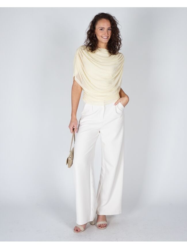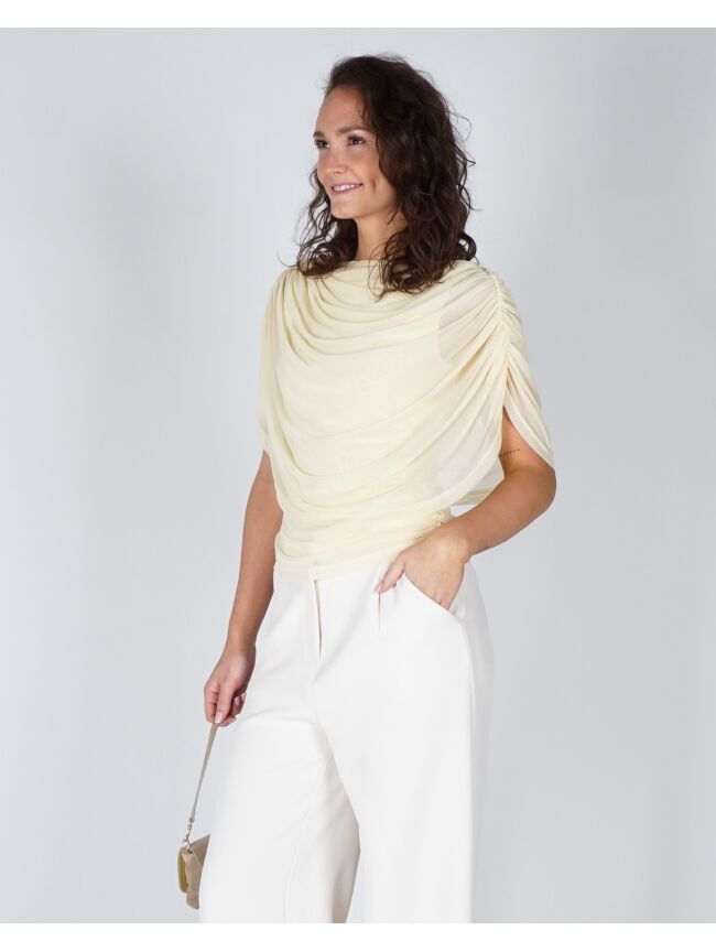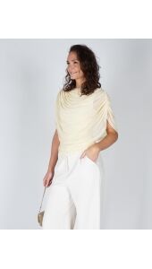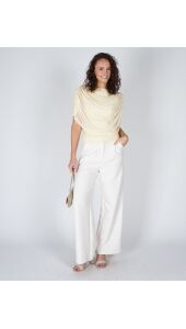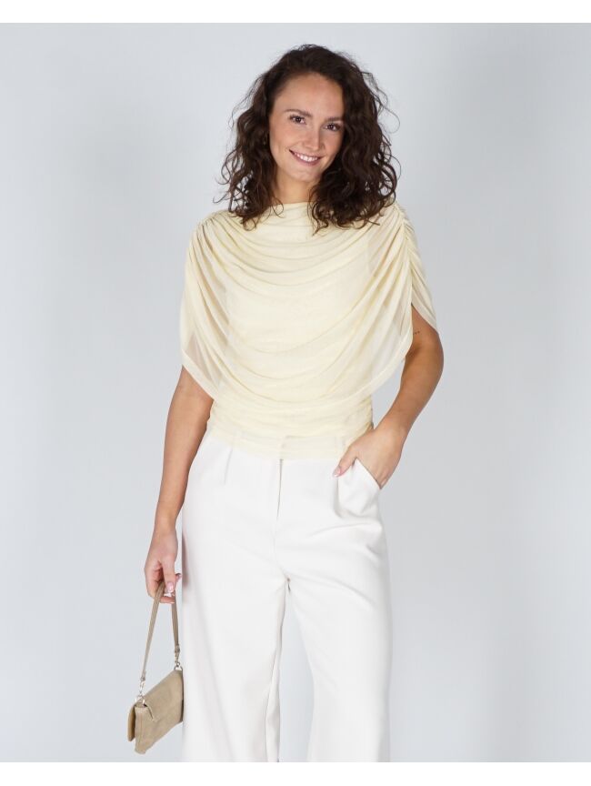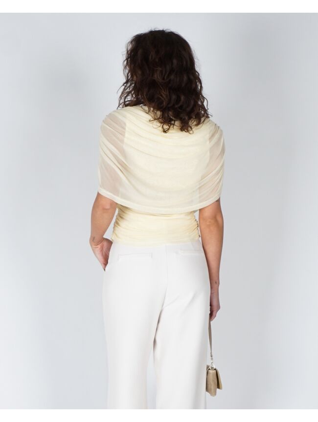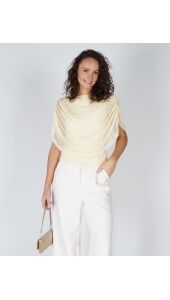 Deze lichtgele top met gedrapeerd design heeft een verfijnde, moderne uitstraling. De doorschijnende stof en subtiele plooidetails geven de top een speelse maar rustige look. Het draperende model valt mooi om het lichaam en zorgt voor een elegant silhouet. Perfect te combineren met een ecru pantalon voor een lichte, stijlvolle outfit die moeiteloos klopt.