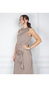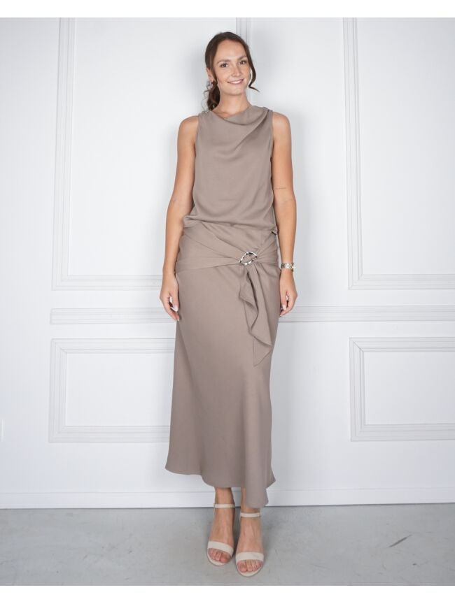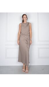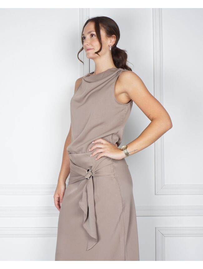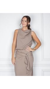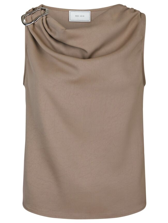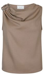Mouwloze top van Neo Noir in donker taupe satijn. De top heeft een gedrapeerde halslijn en een metalen gesp op de schouder, wat het een bijzondere uitstraling geeft.