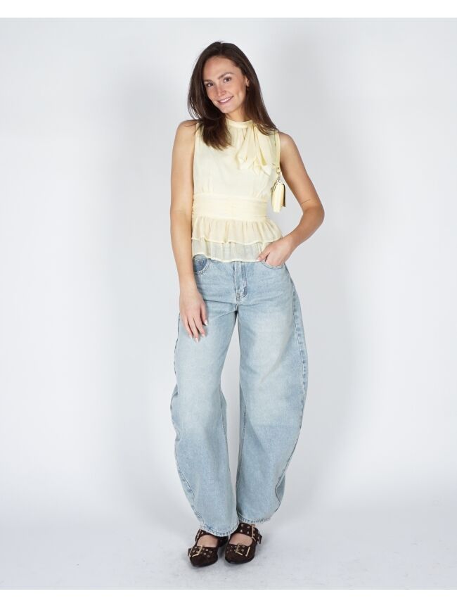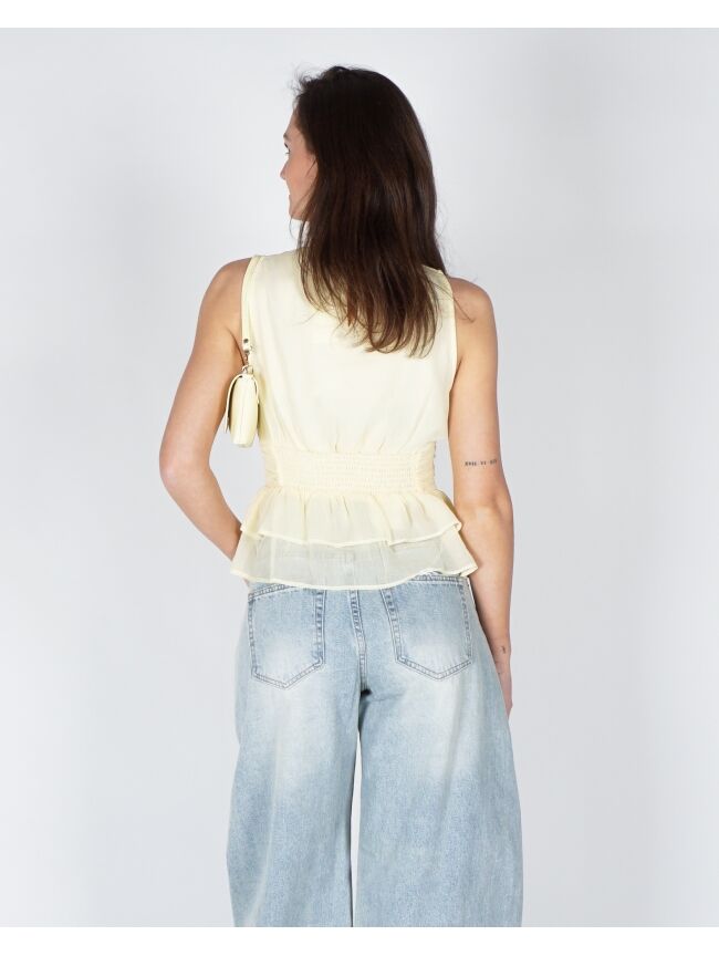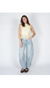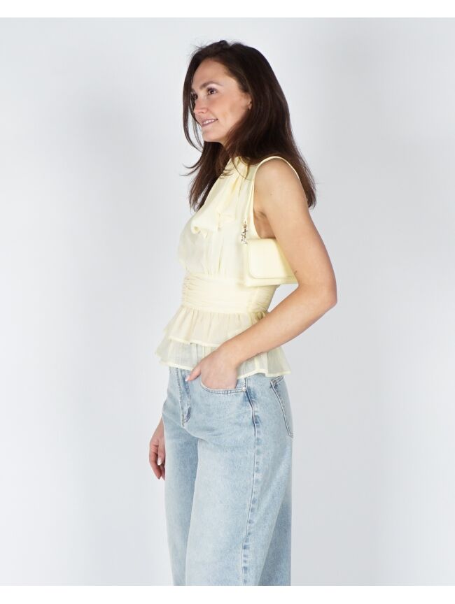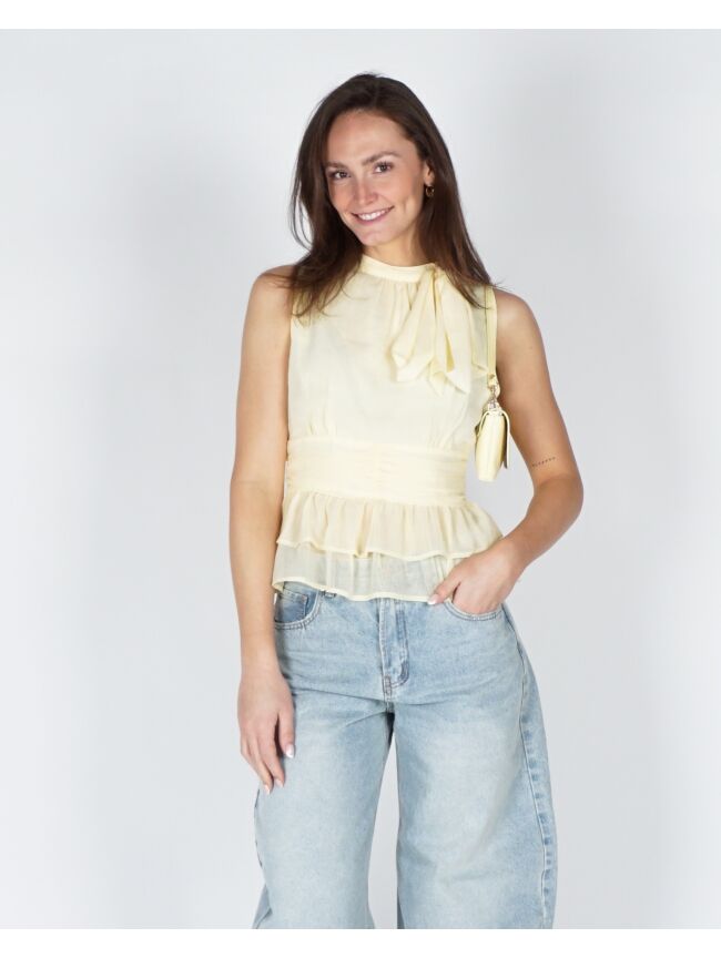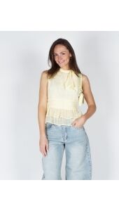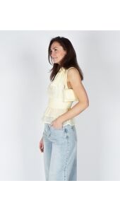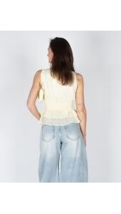 Deze lichtgele top zonder mouwen heeft een frisse, moderne uitstraling. Het mouwloze model zorgt voor een clean silhouet en maakt de top perfect voor warme dagen of om te layeren. De zachte geletint combineert mooi met een ecru pantalon voor een lichte, stijlvolle look.