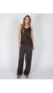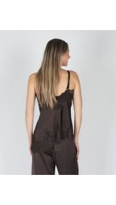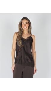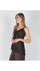 Deze donkerbruine kanten top van Neo Noir straalt elegantie uit dankzij de fijne satijnkwaliteit en de delicate V-hals. De dunne bandjes geven een subtiele, vrouwelijke look, terwijl de asymmetrische kantdetails zorgen voor een speels en uniek effect. Een stijlvolle top die perfect is voor zowel een casual outfit als een avondje uit.