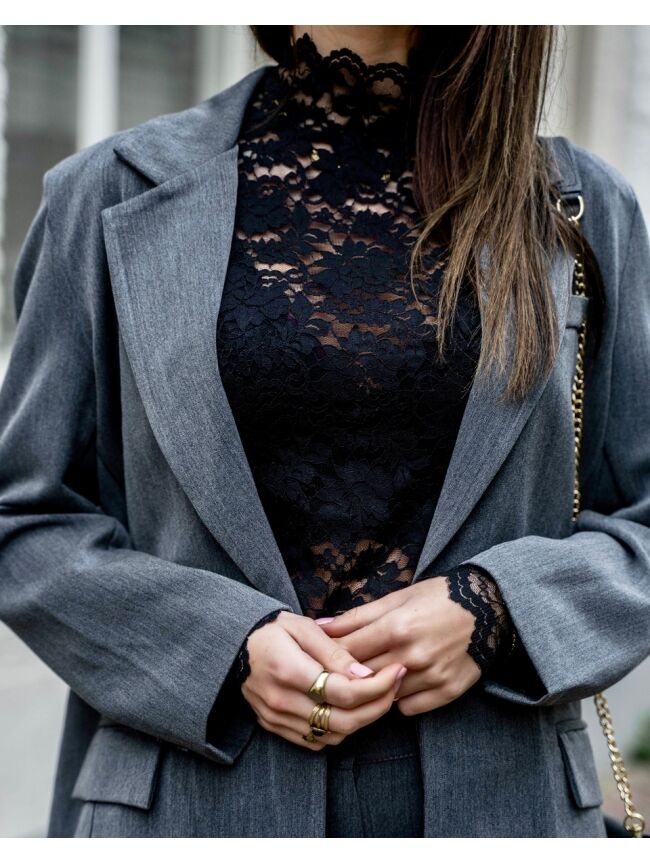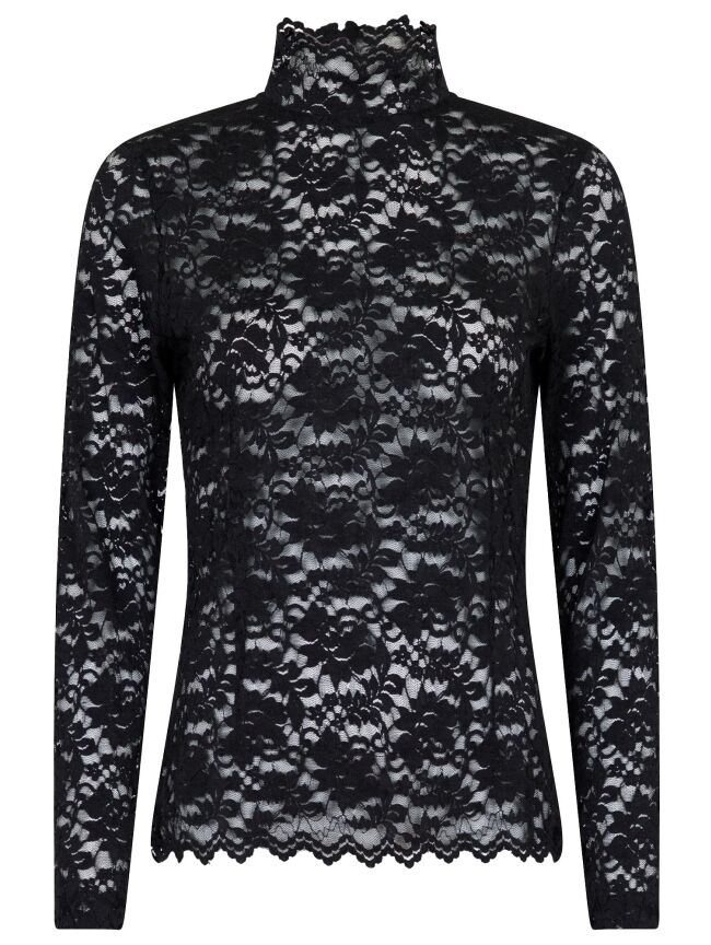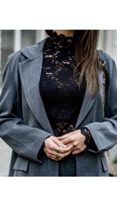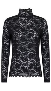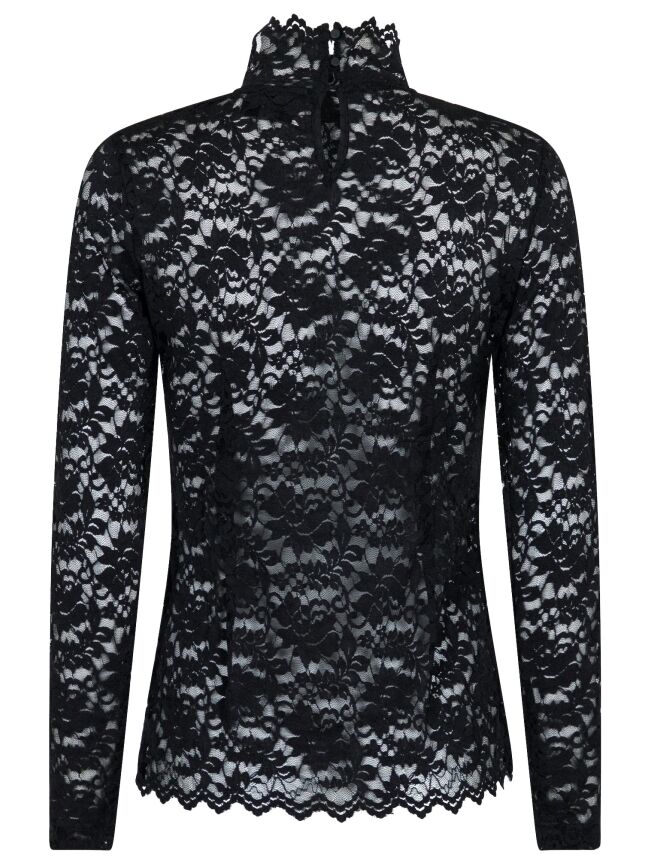 Blouse van stretchkant met col en knoopjes achter in de nek. De blouse is nauwsluitend, maar comfortabel en gemaakt van mooi stretchy kant. Style hem zo, of onder een trui of blazer.