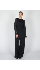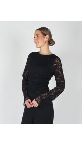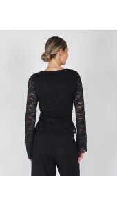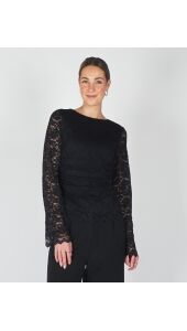 Deze top heeft een asymmetrisch model en is uitgevoerd in een fijne kantkwaliteit die zorgt voor een elegante, vrouwelijke uitstraling. De wijd uitlopende mouwen geven het ontwerp extra beweging en maken dit een stijlvol item dat moeiteloos opvalt. Perfect te combineren voor zowel casual als chique gelegenheden.