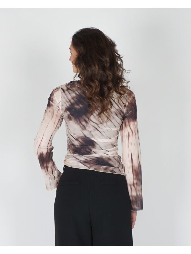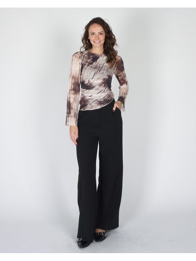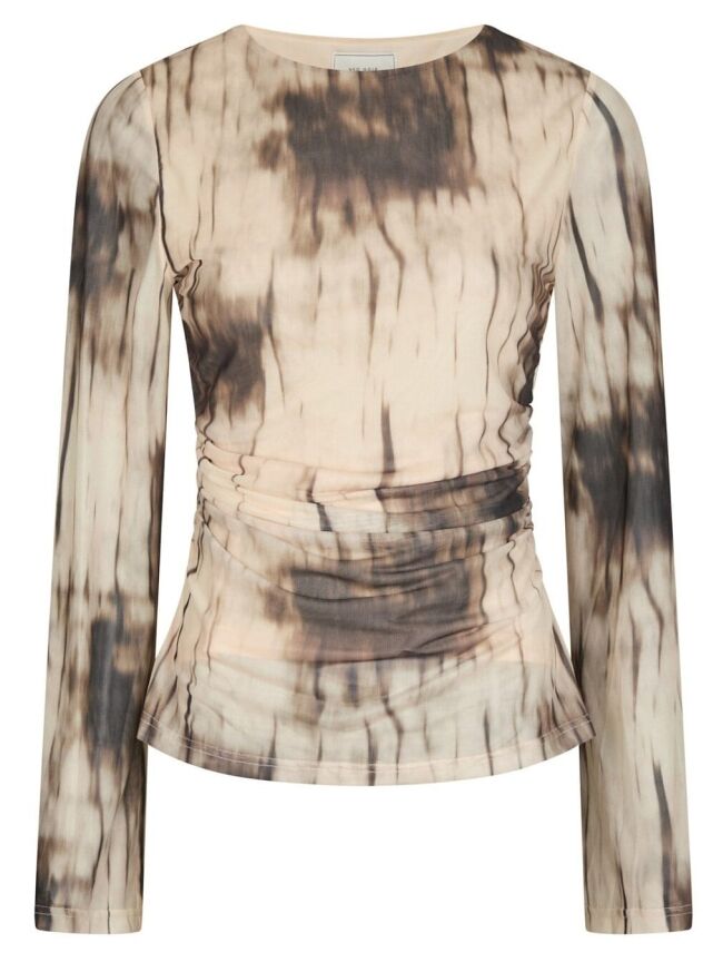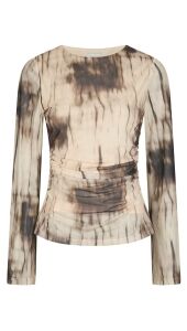 De meshblouse van Neo Noir is uitgevoerd in een warme bruine tint met een subtiel vervaagd printje. De plooidetails bij de taille creëren een flatterende pasvorm, terwijl de lange, wijde mouwen zorgen voor een elegante en moderne uitstraling. Een stijlvolle blouse die moeiteloos combineert met zowel een pantalon als je favoriete jeans.