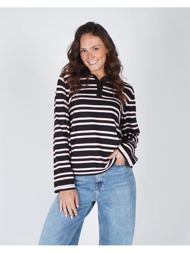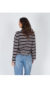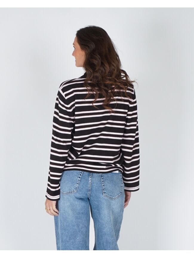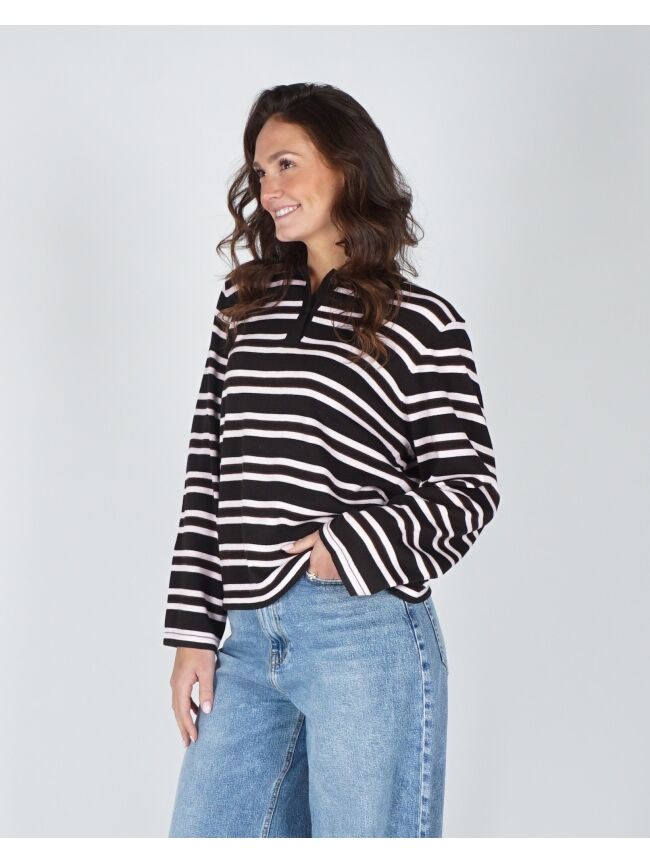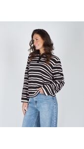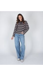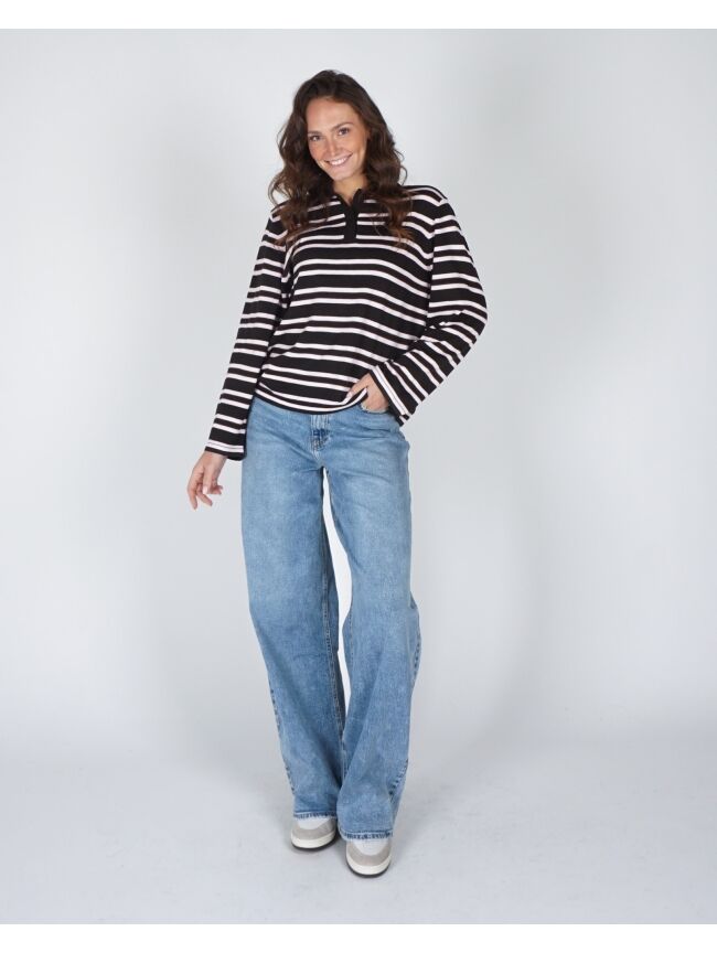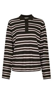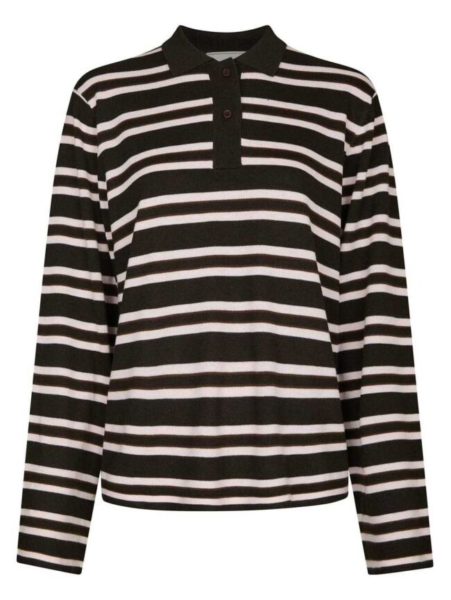 De Mala Polo Knit Blouse van Neo Noir is een moderne knit met een clean, stijlvolle look. Dankzij de subtiele polokraag en korte knopenrij heeft deze top een sportief en tijdloos karakter. De boxy pasvorm zorgt voor een ontspannen en eigentijds silhouet, terwijl de zachte knitkwaliteit met verfijnde strepen een luxe uitstraling geeft. Perfect om casual te dragen met denim of chic te combineren met een pantalon of rok, deze blouse past zich moeiteloos aan elke gelegenheid aan.