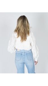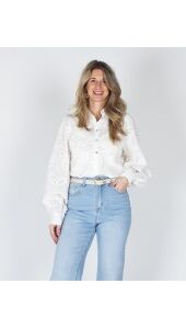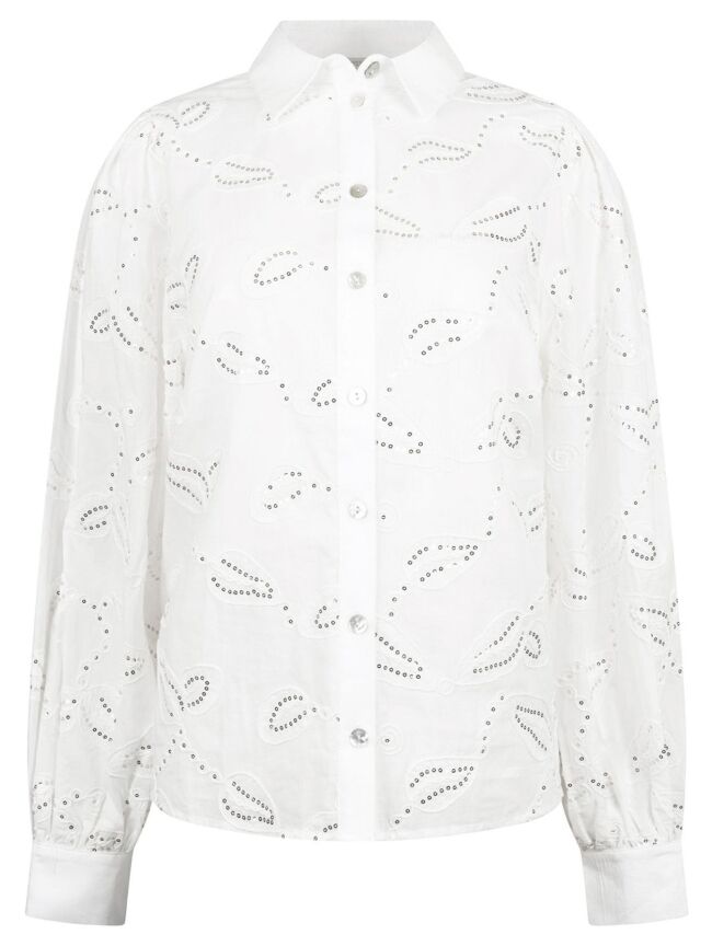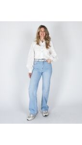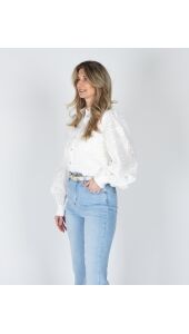 De Milanova Blouse is een elegante witte blouse met subtiele pailletten die elke outfit een vleugje glamour geeft. Tijdloos, chic en perfect voor zowel dag als avond. Combineer met de Abby Bleached Denim voor een stijlvolle, moderne look met een sprankelende twist.