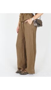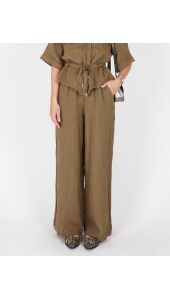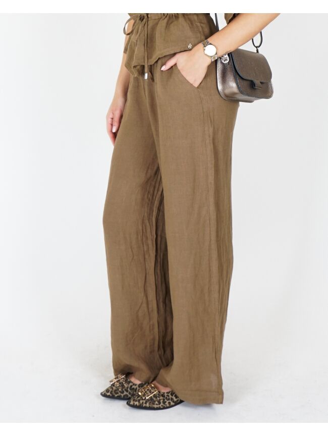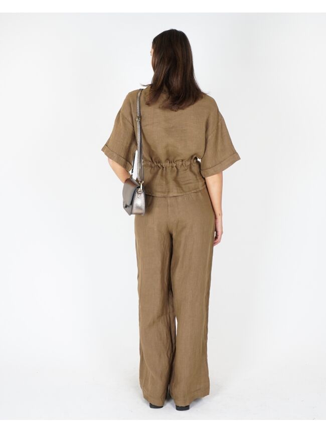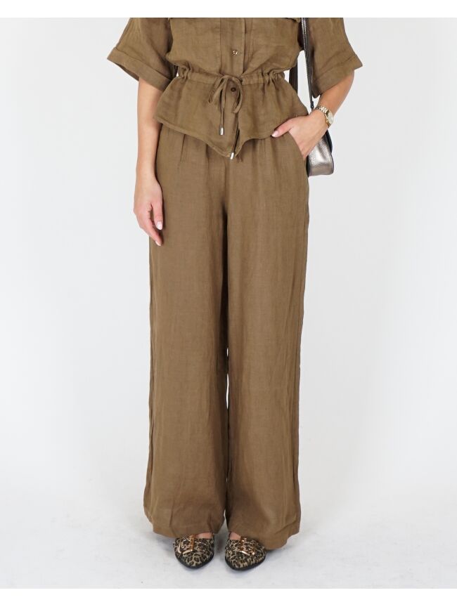 Deze linnen broek is gemaakt van 100% linnen en heeft een aangerimpelde tailleband met koordje voor een comfortabele pasvorm. Perfect te combineren met de Elma blouse voor een luchtige en stijlvolle outfit.