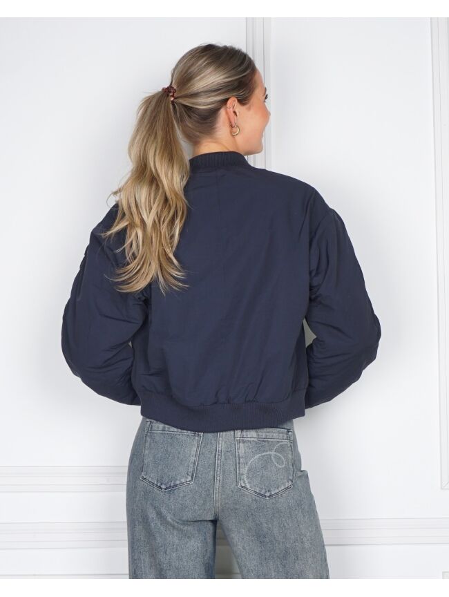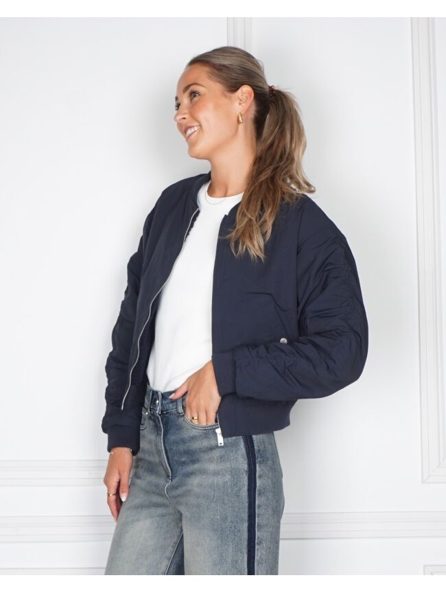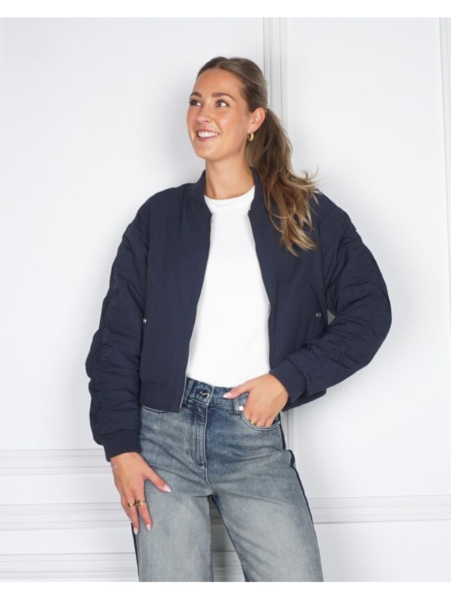 De Celeste Jacket is een modern bomberjack met een iets lossere, boxy pasvorm. Gemaakt van stevig polyester en afgewerkt met een subtiel doorgestikt detail over de mouwen voor een sportieve touch.