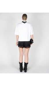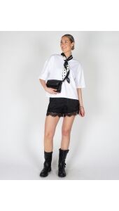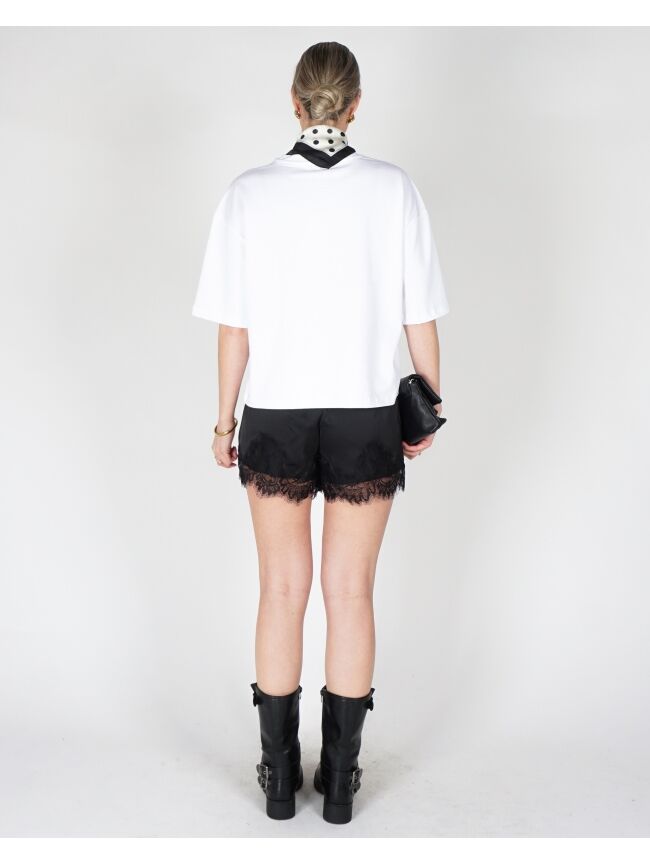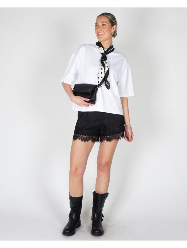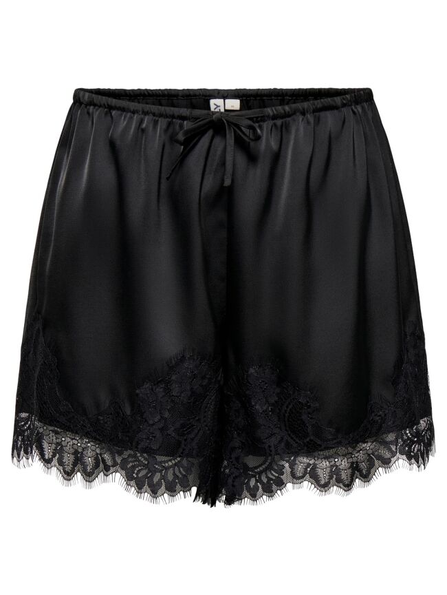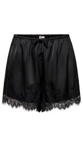 Deze zwarte satijnen short straalt luxe en elegantie uit. De kanten afwerking zorgt voor een vrouwelijke en verfijnde touch. Perfect voor zowel een casual outfit als een chique look.