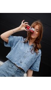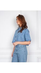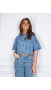 Denim blouse met korte mouwen. Ontworpen met parels all-over. Afgewerkt met een doorlopende knoopsluiting en een klassieke kraag. Combineer met de PAYTON jeans voor de perfecte look!